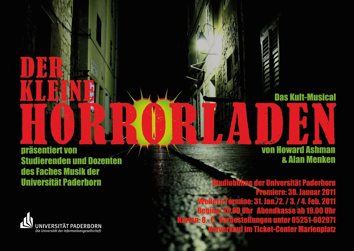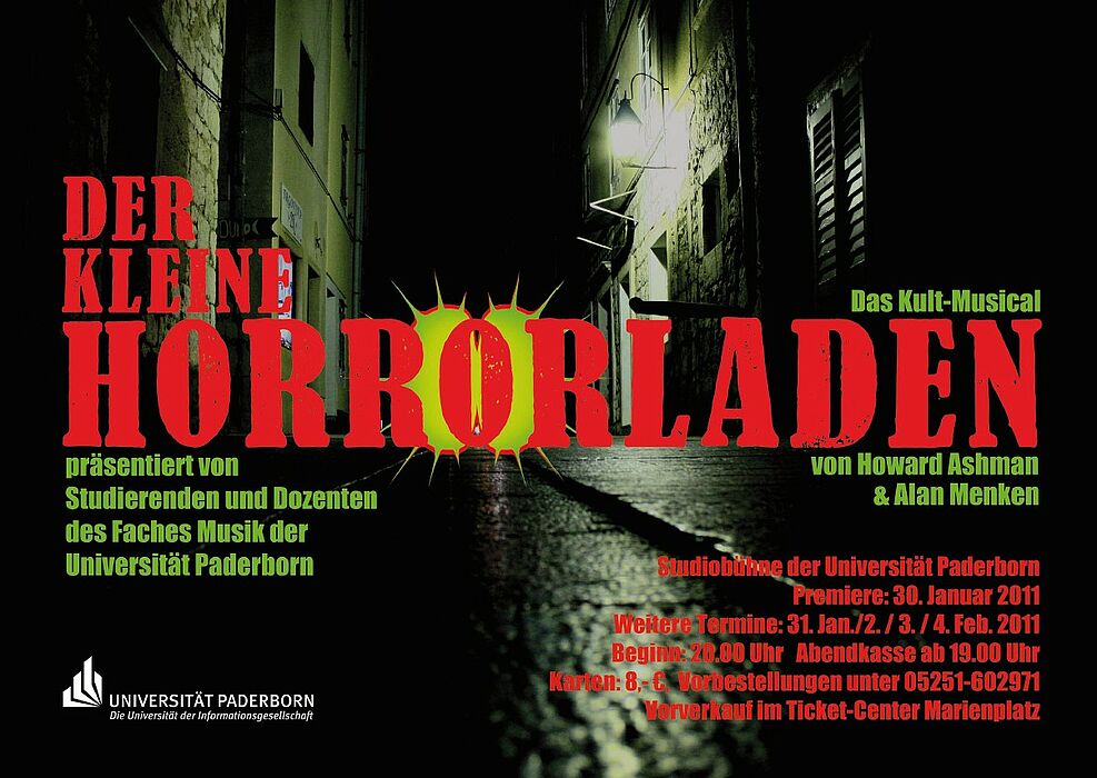 Studierende des Faches Musik an der Universität Paderborn präsentieren unter der Regie von Prof. Dr. Thomas Krettenauer und der musikalischen Leitung von Uli Lettermann das Kultmusical „Der kleine Horrorladen“. Die absurde Geschichte des kleinen Blumenladenangestellten, der durch eine fleischfressende Pflanze zu zweifelhaftem Ruhm kommt, überzeugt nicht nur durch die witzige Geschichte, sondern auch durch die mitreißende Musik von Oscar-Gewinner Alan Menken.