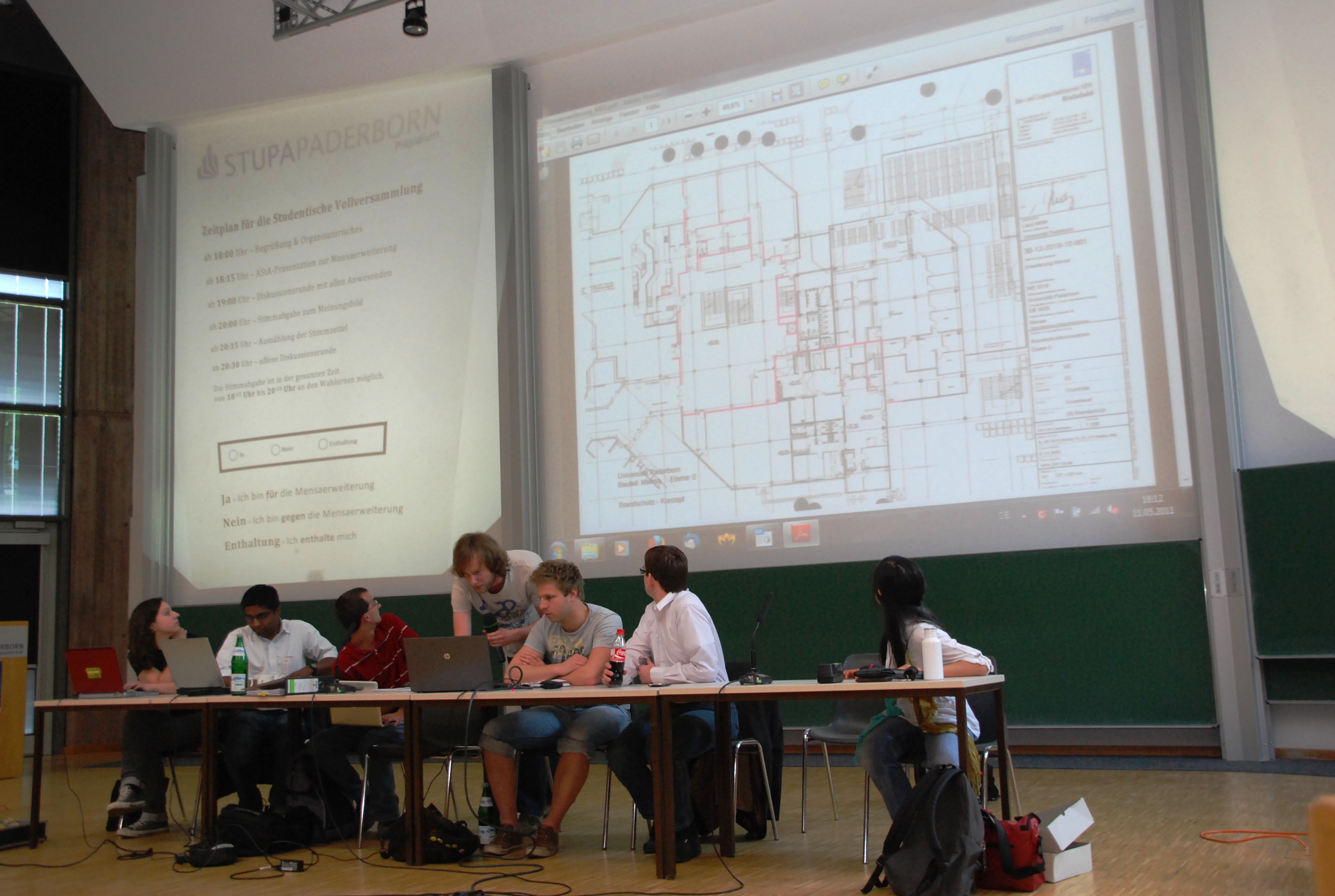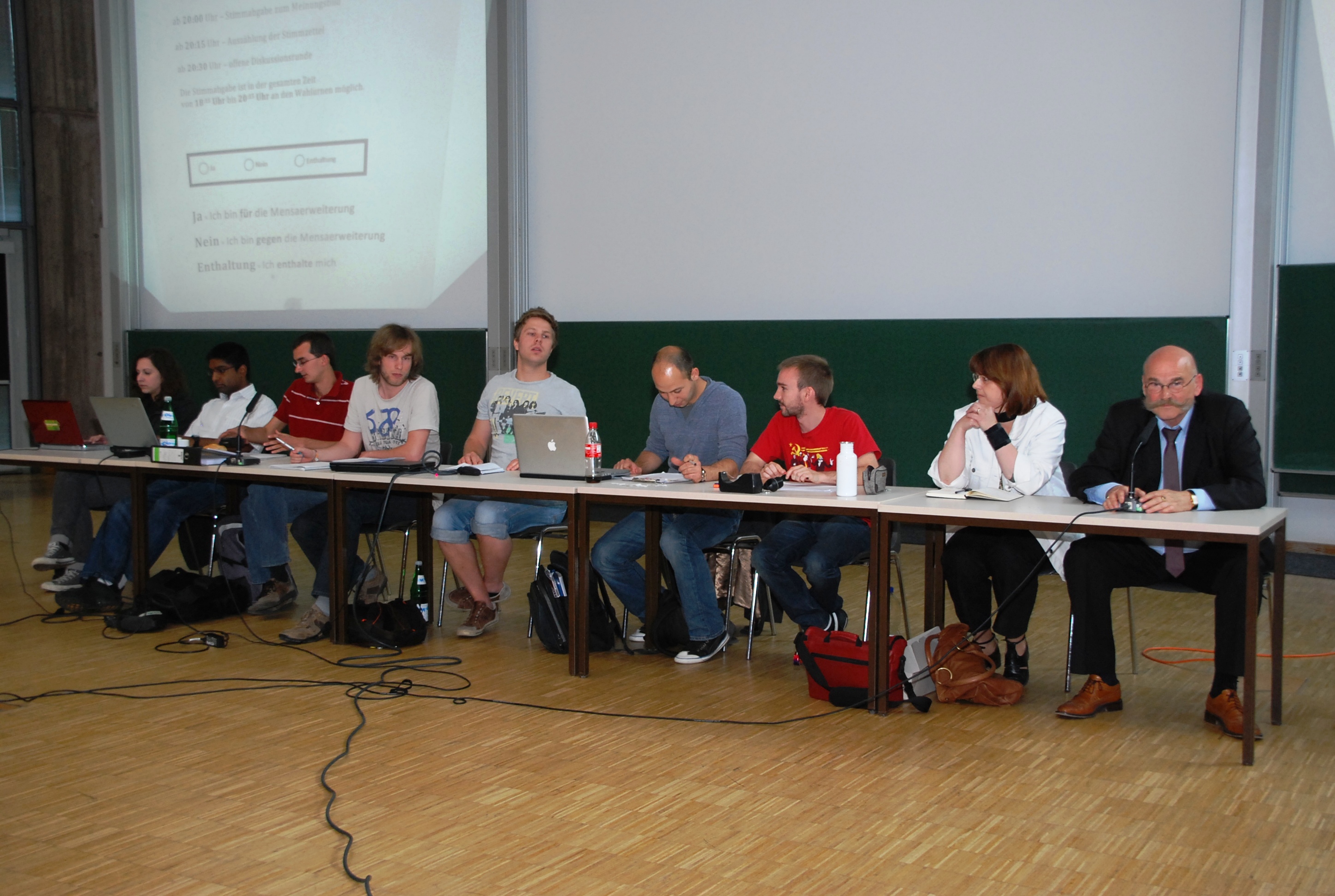 Rund 280 Zuhörer verfolgten die Versammlung, die sich im Laufe des Abends zu einer munteren Diskussion entwickelte, live im Hörsaal und ein paar weitere sicher auch über den Live-Stream im Internet. Nach der Abstimmung dann das erste richtungsweisende, wenn auch nicht repräsentative, Signal für das weitere Vorgehen: Mit 154 zu 84 Stimmen stimmten die Studenten für den Ausbau der Mensa.