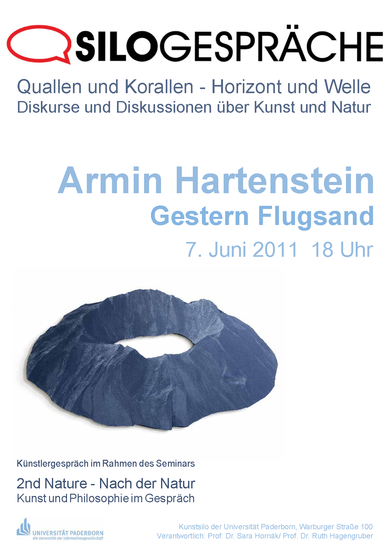 Am 7. Juni wird Armin Hartenstein im Rahmen des Seminars „2nd Nature – Nach der Natur“ (Prof. Dr. Sara Hornäk, Prof. Dr. Ruth Hagengruber) um 18 Uhr im Kunstsilo einen Vortrag zu seinem künstlerischen Werk halten.