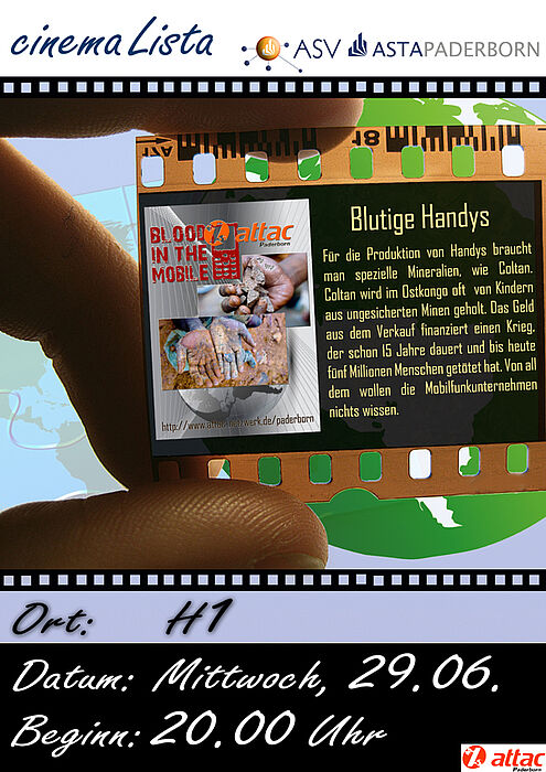 In seiner nächsten Vorführung am Mittwoch, den 29.06.2011, um 20.00 Uhr zeigt AStA-Cinemalista daher den Film "Blutige Handys" in Kooperation mit Attac Paderborn, um Bewusstsein für diese Zustände zu schaffen.