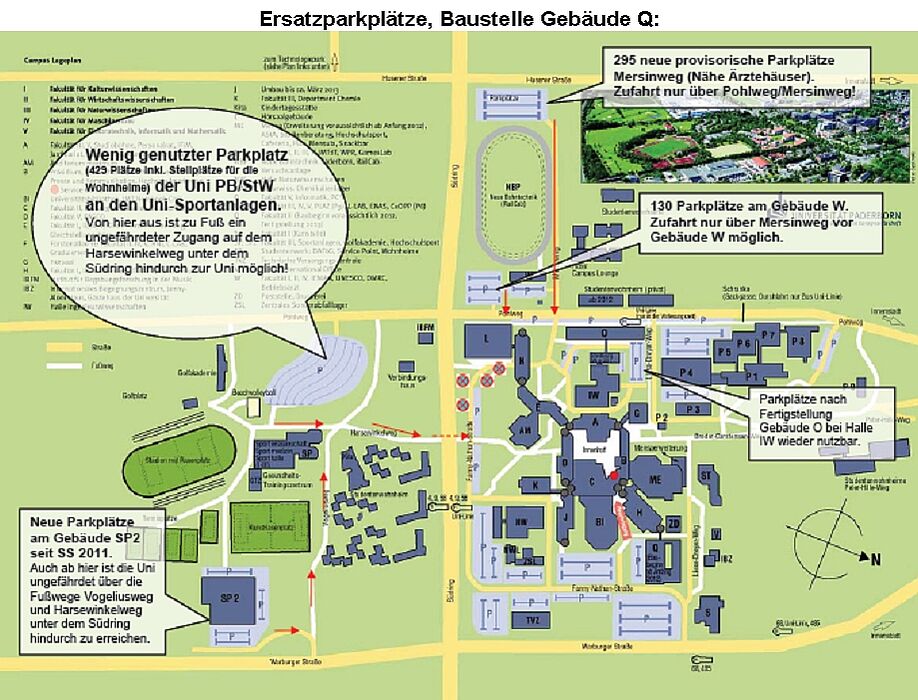 Neben den sonstigen Parkplätzen sind Ersatzparkplätze an den Sportanlagen und am Mersinweg sowohl beim Gebäude W als auch auf dem provisorischen Uni-Parkplatz (295 Plätze) am Ende des Mersinweges in ausreichender Zahl vorhanden.