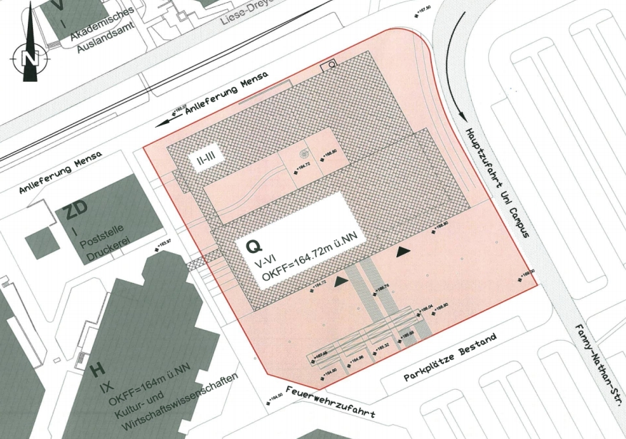 Der rote Bereich auf der Zeichnung ist die Baustelleneinrichtung Neubau Bauteil Q.