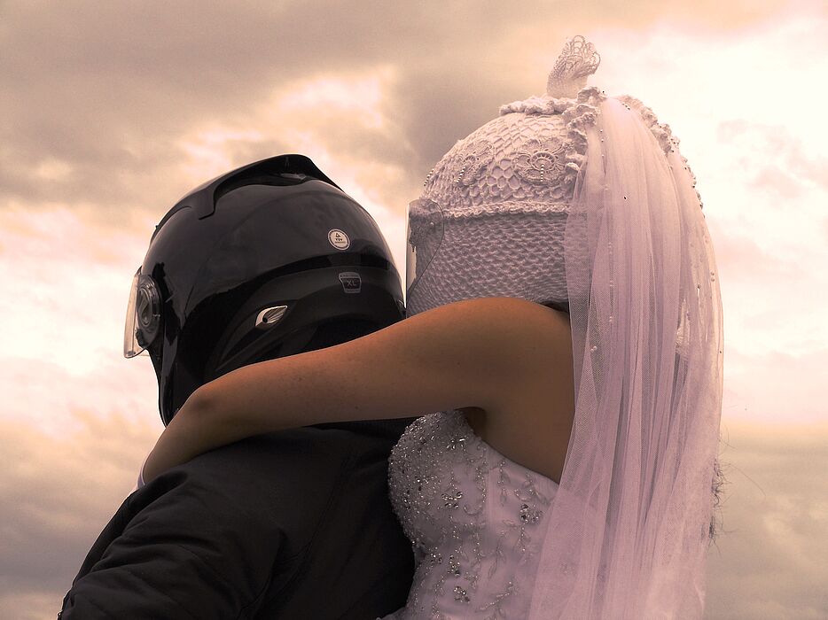 Es werden handgefertigte Motorradhelme gezeigt, die den alltäglichen Gegensatz von Mann und Frau in der Freizeitbeschäftigung, sowie Schmuck und Schutz kontrastreich darstellen.