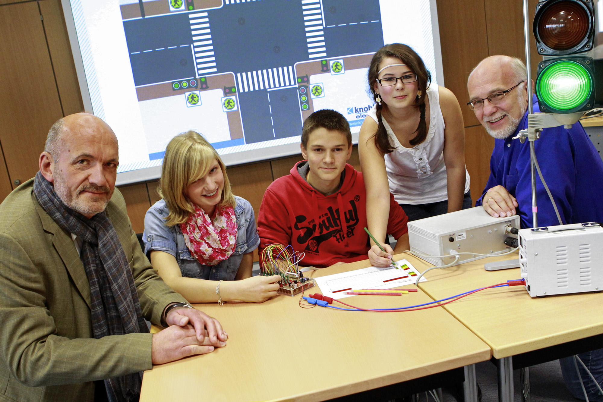 Rudolf Broer, Lisa, René, Michelle und Detlef Schubert, didaktischer Leiter des Schülerlabors, (v. links) beim Test mit der Ampelschaltung.