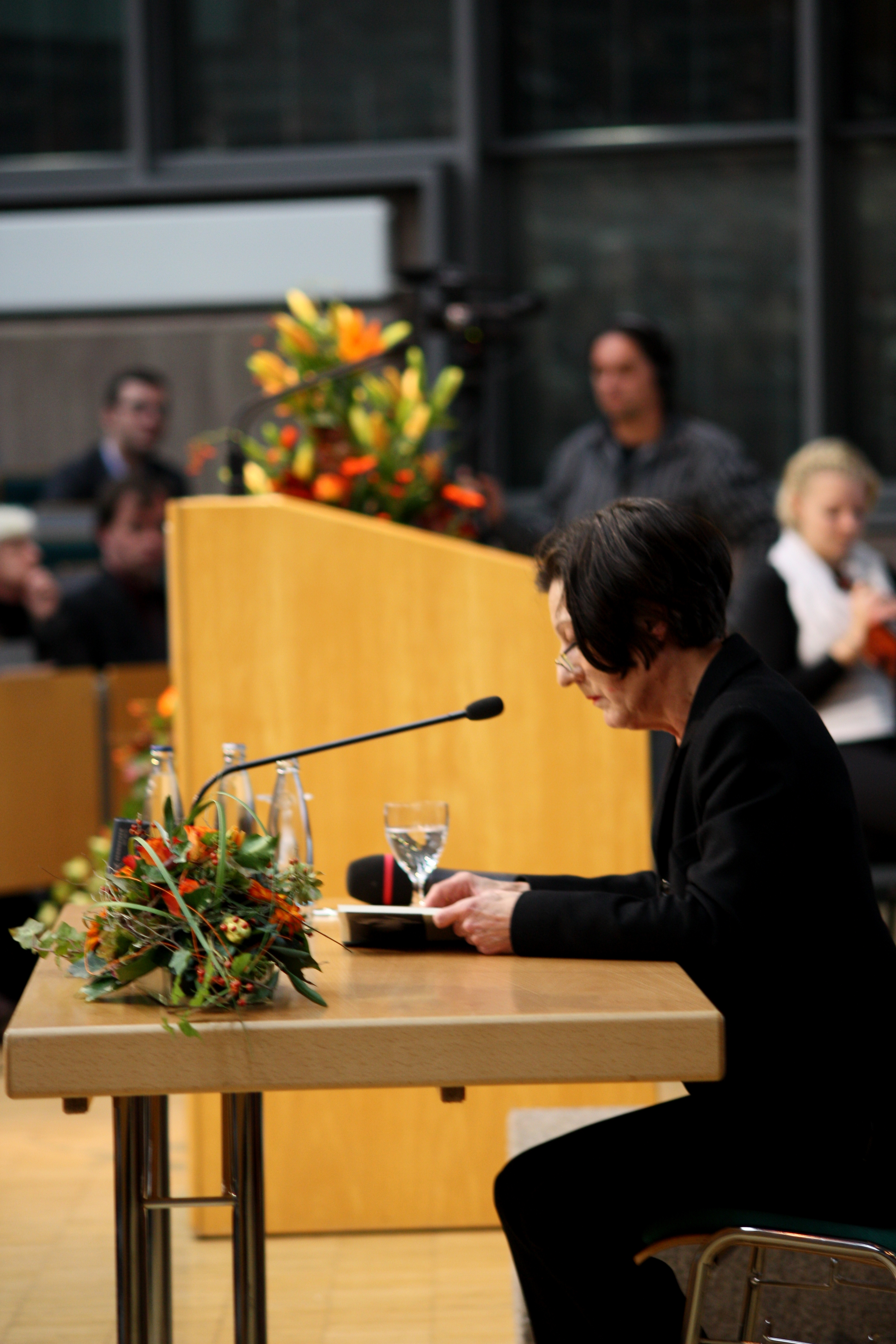 In ihrer Dankesrede ging Herta Müller auf ihre lange Verbundenheit mit der Universität Paderborn ein. "Ich bin immer sehr gerne hierhergekommen und danke Ihnen sehr für diese Auszeichnung", sagte die Literatur-Nobelpreisträgerin. An der Universität Paderborn habe sie erfahren, was Normalität bedeutet. Selbst nachzudenken, habe sie erst in Paderborn gelernt und auch, dass Studenten keine Angst haben müssen.