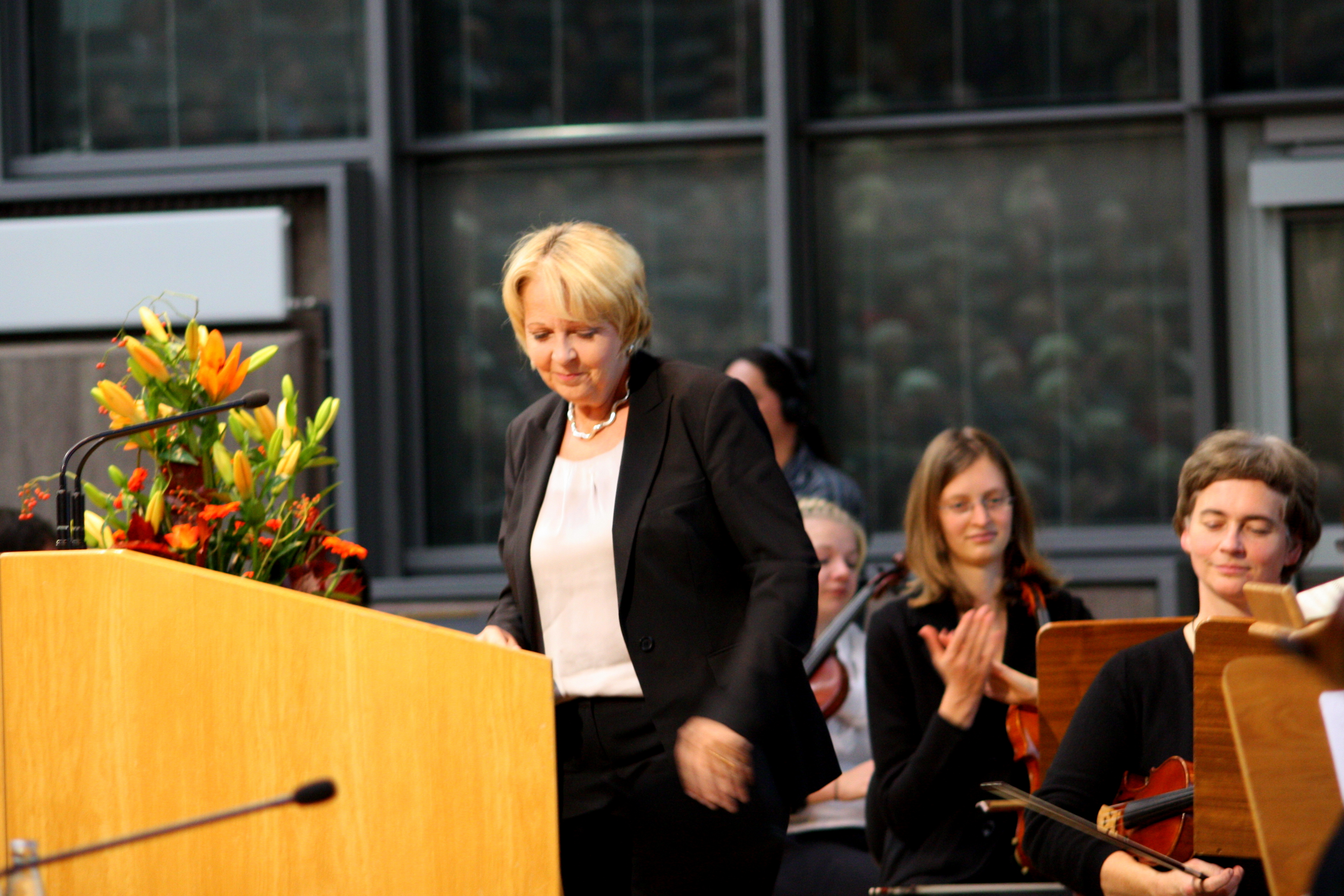 Auch NRW-Ministerpräsidenten Hannelore Kraft gratulierte der Universität zum 40-jährigen Bestehen und zur Entscheidung, eine so bedeutende Schriftstellerin mit einer Ehrenpromotion auszuzeichnen, und beglückwünschte die Literatur-Nobelpreisträgerin zur ihrem Titel. Die Politikerin zog eine Linie von der ersten Ansiedlung der Deutschen in Rumänien bis zu Herta Müllers Texten. Die Nobelpreisträgerin habe das Bewusstsein dafür wachgehalten und stets geschärft, dass nach dem Zweiten Weltkrieg eben nicht alle Diktaturen verschwunden seien. Zwar seien die meisten Länder mittlerweile demokratisch regiert, doch diese Errungenschaft müssten die Menschen tagtäglich verteidigen. Um dies auch zu erreichen, bräuchten wir "den klaren, unbestechlichen Blick, wie ihn Herta Müller besitzt", sagte Kraft.