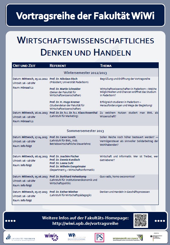 Die Vortragsreihe beginnt am 5.12.2012 um 16 Uhr im Gebäude L, Ebene 0, Hörsaal L2 mit einer Eröffnungsveranstaltung mit Beiträgen von Prof. Dr. Nikolaus Risch (Präsident der Universität Paderborn), Prof. Dr. Martin Schneider (Dekan der Fakultät für Wirtschaftswissenschaften) und Prof. Dr. H.-Hugo Kremer (Studiendekan der Fakultät für Wirtschaftswissenschaften) und umfasst an den folgenden Terminen jeweils spannende Vorträge von Professorinnen und Professoren der einzelnen Departments. Das vollständige Programm ist im Internet unter http://wiwi.upb.de/vortragsreihe verfügbar.
