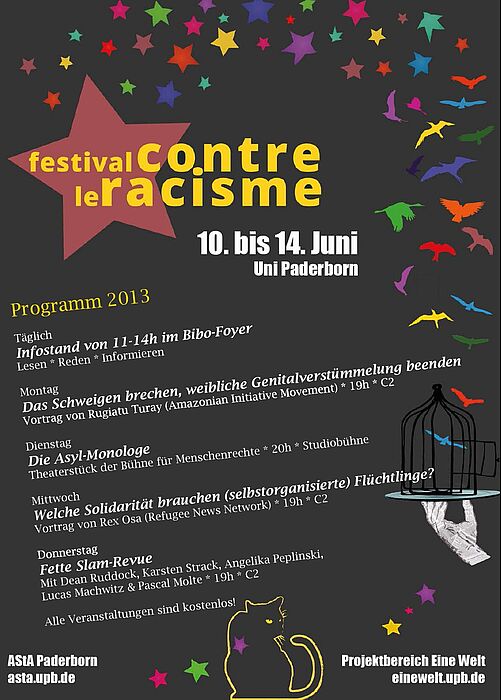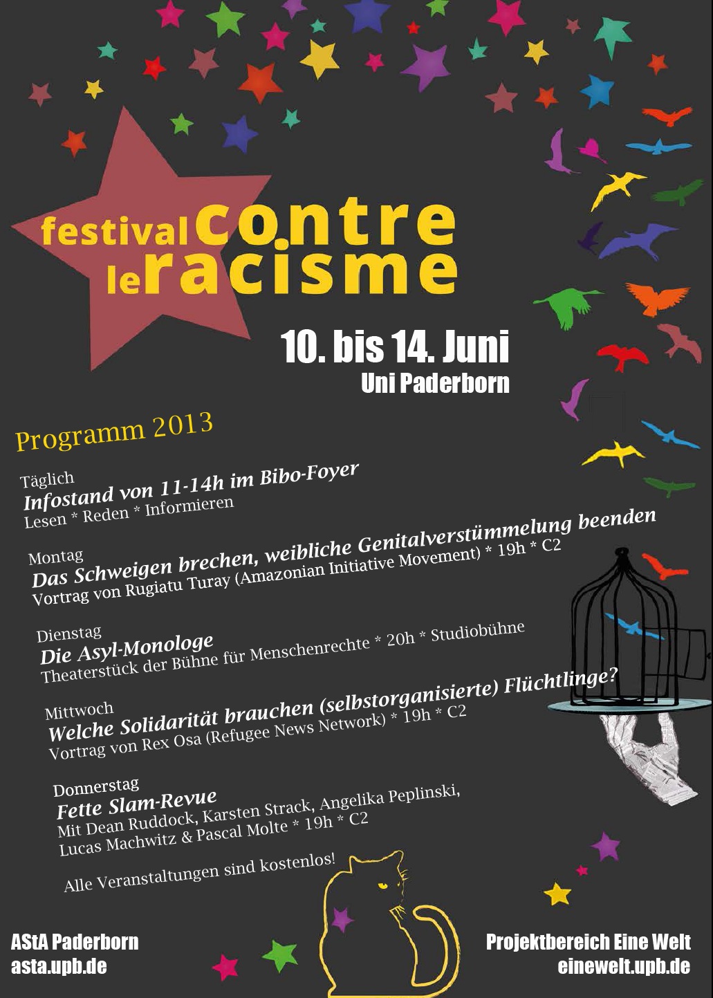 In der kommenden Woche findet erneut das Festival Contre le Racisme an der Uni statt, diesmal organisiert vom Projektbereich Eine Welt und dem AStA. Im Rahmen dessen möchten der Projektbereich Eine Welt auf die Veranstaltungen aufmerksam machen, die von Montag bis Donnerstag an der Uni stattfinden werden.