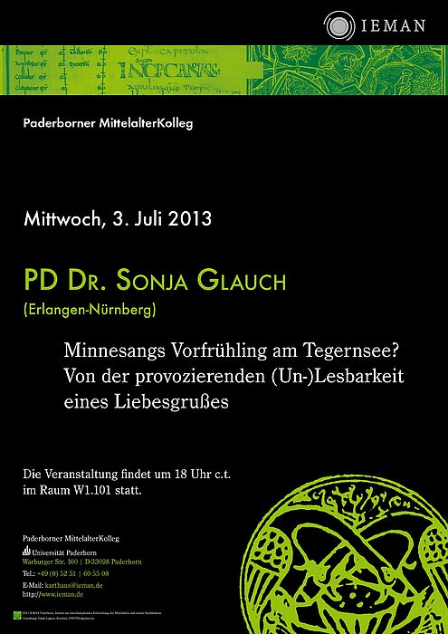 Das "Institut zur interdisziplinären Erforschung des Mittelalters und seines Nachwirkens" (IEMAN) lädt am kommenden Mittwoch, 3. Juli 2013, 18 Uhr c. t., im Raum W 1.101 zu einem Vortrag von Frau PD Dr. Sonja Glauch (Erlangen-Nürnberg) ein, die über das Thema "Minnesangs Vorfrühling am Tegernsee? Von der provozierenden (Un-)Lesbarkeit eines Liebesgrußes" sprechen wird: Der Vortrag wird die bekannten mittelhochdeutschen Liebesverse 'Ich bin dîn, du bist mîn' in ihrem Überlieferungskontext betrachten: in ihrer Einbettung in die lateinische klösterliche Briefkultur. Dabei ergeben sich Anknüpfungspunkte an andere Phänomene der Sprachmischung und an weitere Belege aus dem 12./13. Jahrhundert für das monastische Interesse am Thema der Liebe und des Sprechens über Liebe. Vor allem aber wirft das Textchen zwei Fragen auf: Was hat die Sprachdifferenz Volkssprache-Latein mit der Differenz Frauen-Männer zu tun und inwiefern erweist es sich als exemplarischer Stolperstein für die Ansätze und Möglichkeiten einer Geschlechtergeschichte? Interessierte sind herzlich eingeladen.