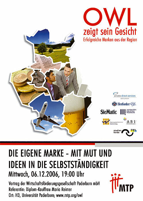 Mit einem Vortrag der Wirtschaftsförderungsgesellschaft Paderborn mbH zum Thema "Die eigene Marke - Mit Mut und Ideen zur Selbstständigkeit" findet am Mittwoch, 6.12.2006, 19.00 Uhr an der Universität Paderborn im Hörsaal H3 der zweite von insgesamt sechs Vorträgen dieser Reihe statt. Veranstalter ist die studentische Marketinginitiative MTP (Marketing zwischen Theorie und Praxis e.V.)