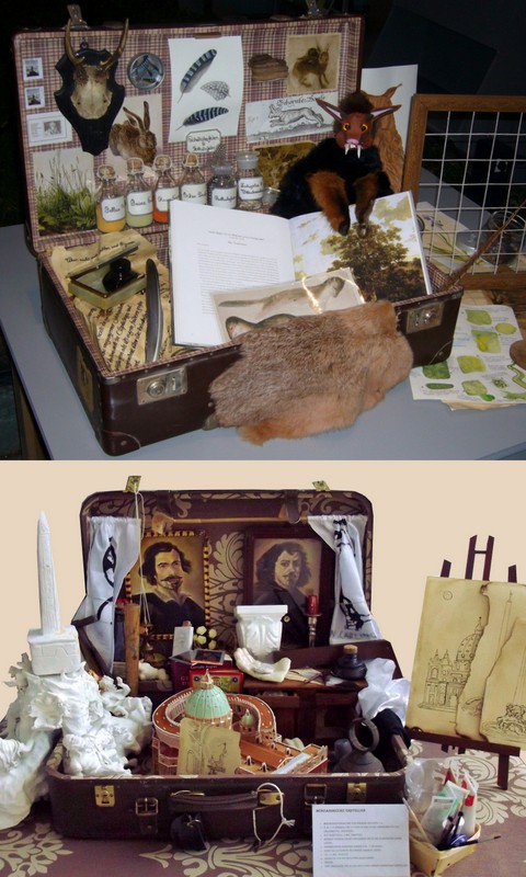 Zum Beispiel werden in der „Museums-Kiste“ von Corinna Pott die Geheimnisse des „Rolands“, dem Wahrzeichen der Hansestadt Bremen, gelüftet und der Koffer von Svenja Claes entführt die BesucherInnen in die literarische Welt der Buddenbrooks in Lübeck. Die „Städtetour“ endet in der „ewigen Stadt“ Rom mit den Museumskoffer von Anika Schediwy, der die spannende Geschichte der Künstlerrivalität zwischen Borromini und Bernini erzählt. Auf dem Weg durch die Ausstellung begegnen den BesucherInnen auch verschiedene Künstler. Zum Beispiel treffen die BesucherInnen im Museumskoffer von Katharina Richter auf Caspar David Friedrich und im Koffer von Julia Verkist werden die BetrachterInnen durch Monets Farb- und Lichtspiel des Impressionismus verzaubert. Verzaubert werden die BesucherInnen auch von der Welt der Märchen der Brüder Grimm, wenn der Museumskoffer von Sabrina Zimmermann erzählt: „Es war einmal im Märchenwald…“. Neben kunst- und kulturgeschichtlichem Welterbe wird in der Ausstellung auch das Weltnaturerbe präsentiert. Beispielsweise stehen im Museumskoffer von Oxana Buk naturgetreue Pilzmodelle im Fokus oder Sabrina Zimmermann inszeniert den Wald in Form eines Naturalienkabinetts. Barbara Finke zeigt in ihrem Museumskoffer und in naturalistisch-atmosphärischen Pastellbildern die Schönheit des Wattenmeers.