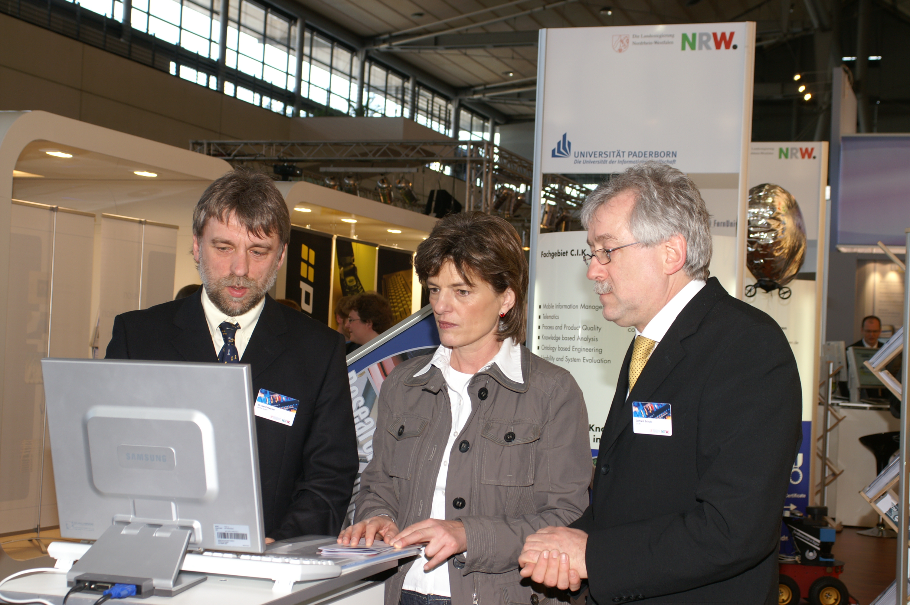 Im Rahmen der weltweit größten Messe zur Darstellung digitaler Lösungen aus der Informations- und Kommunikationstechnik CeBIT besuchte MdB Ute Berg am 15.3.2007 den Gemeinschaftsstand NRW. Als Mitglied des Ausschusses für "Wirtschaft und Technologie" und stv. Vorsitzende der gleichnamigen Arbeitsgruppe der SPD-Bundestags-Fraktion kümmert sie sich intensiv um die Stärkung neuer Technologien und den Technologietransfer zwischen Wissenschaft und Wirtschaft. Dementsprechend interessierte sie sich insbesondere auch für die innovativen Entwicklungen der Universität Paderborn, die auf der diesjährigen CeBIT mit zwei Exponaten zum Thema Innovationen bei der Sicherheit sowie einem Workflowsystem im Bereich Patente auf dem Gemeinschaftsstand NRW, Halle 9/ Stand C16 vertreten ist. Berg führte u. a. Gespräche mit Gerd Kachel (Kachel GmbH - Kooperationspartner beim Projekt Patentworkflow) und Gerd Schulz vom c-lab, einem Kooperationspartner des Exponats Patentworkflow.