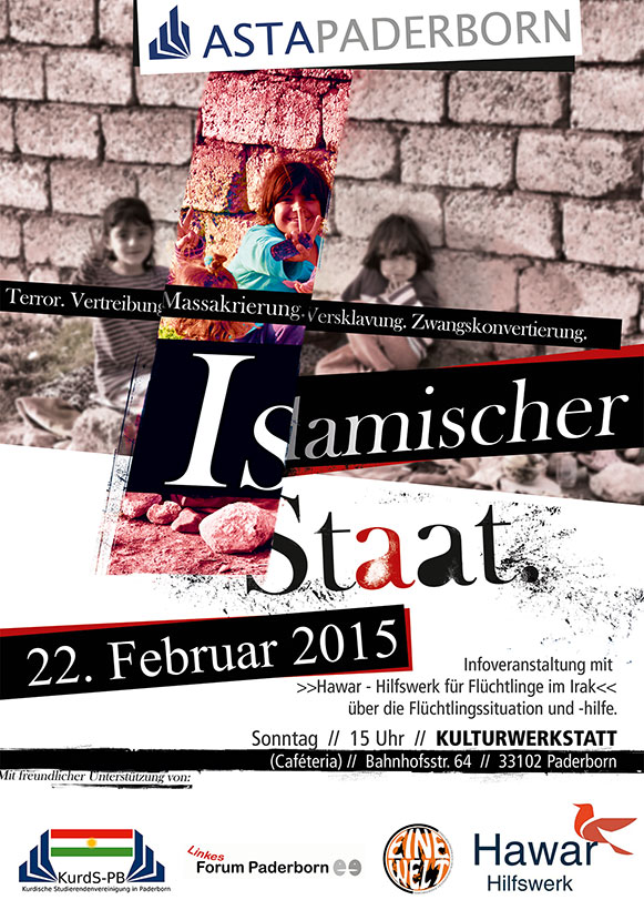 Der Allgemeine Studierendenausschuss (AStA) der Universität Paderborn organisiert für Sonntag, 22. Februar, von 15-17.30 Uhr in der Kulturwerkstatt (Bahnhofstr. 64, 33102 Paderborn) eine Infoveranstaltung mit Hawar-Hilfswerk für Flüchtlinge im Irak über die Flüchtlingssituation und -hilfe für die IS-Opfer im Irak und in Syrien.