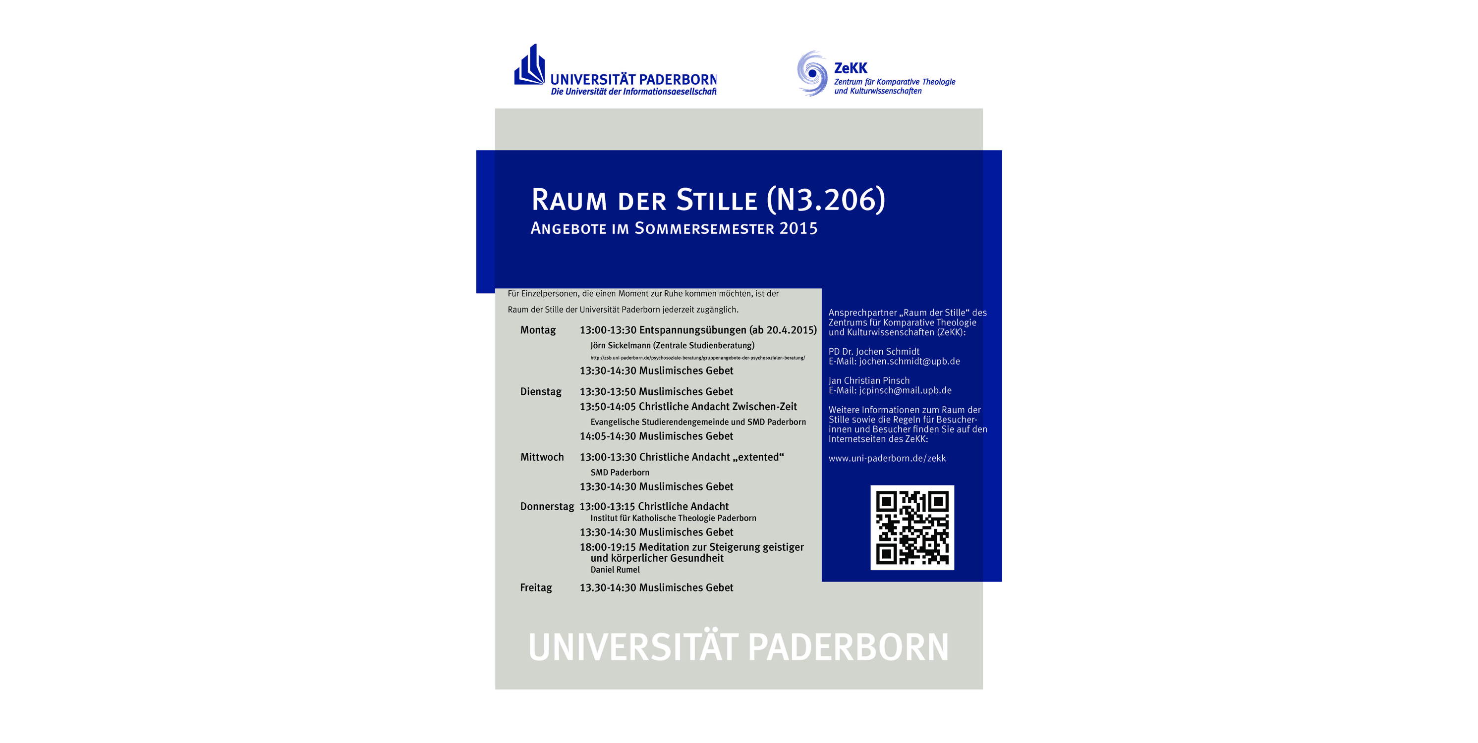 Im Uni-Getümmel tut es gut, einmal abzuschalten und die Hektik des Alltags für einige Augenblicke zu unterbrechen. Mit dem Raum der Stille befindet sich in N3.206 eine Anlaufstelle für alle Ruhesuchenden. Ob Stille-Meditation, christliche Andacht, muslimisches Gebet oder Entspannungsübung: Der Raum der Stille ist keiner bestimmten Religion oder Weltanschauung gewidmet. Er ist offen für alle Angehörigen und BesucherInnen unserer Universität. Gruppen dürfen den Raum (nach vorheriger Anmeldung) für ein Ritual nutzen.