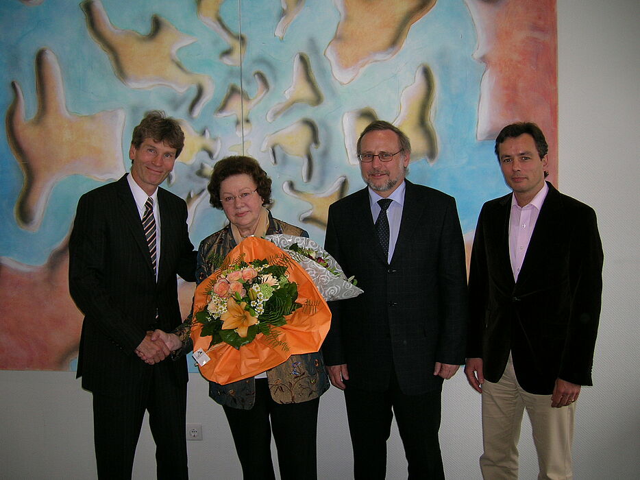 „Ihnen gebührt unser Dank für Ihre langjährige Unterstützung“, betonte Prof. Herzig bei der Verabschiedung in einer Feierstunde vor Kolleginnen und Kollegen. Das europäische Denken hätte sie in die Schulen hineingetragen, lobte Prof. Dr. Volker Peckhaus, Dekan der Fakultät für Kulturwissenschaften. Den Dank der Hochschulleitung sprach Uni-Rektor Prof. Dr. Nikolaus Risch aus. Doch nicht nur die aus dem Dienst Ausscheidende wurde beschenkt, sie selber schenkte der Universität auch etwas: historische Bilder vom Gründungsakt der Unterzeichnung der Europäischen Gemeinschaft mit den Staatsmännern Konrad Adenauer und Robert Schumann vor 57 Jahren in Paris.