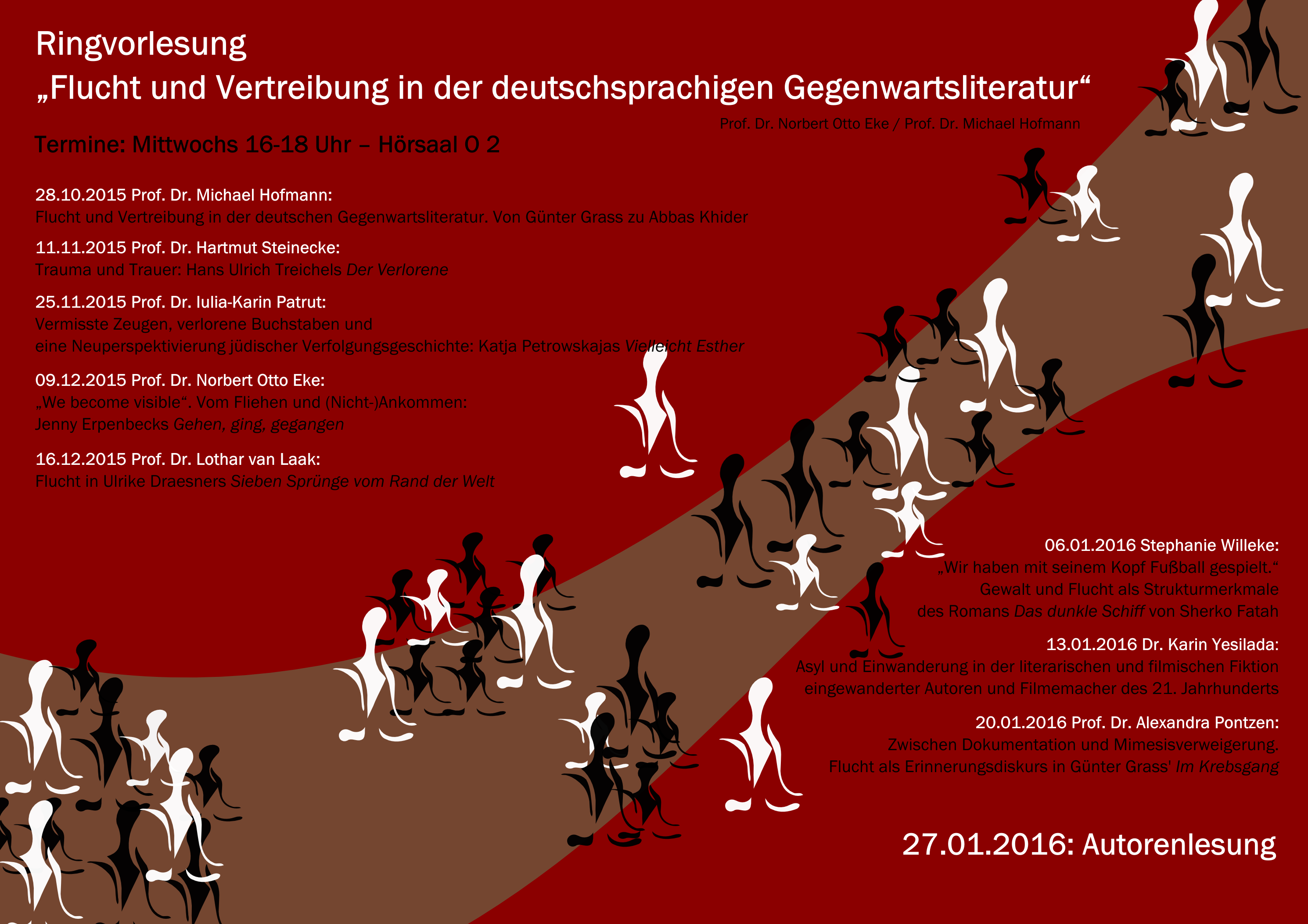 Aus aktuellem Anlass richtet die Vorlesungsreihe den Blick auf die literarischen Verarbeitungen existenzieller Erfahrungen der Flucht, des Transitdaseins, der Not des Unterwegsseins und der Fremdheit in einem Land, das die verlorene Heimat ersetzen muss. Dabei schlagen die Vorträge eine Brücke zwischen historischen Flucht- und Vertreibungserfahrungen (exemplarisch dafür Günter Grass‘ Erzählung „Im Krebsgang“) und der Gegenwart mit ihren kriegs- und armutsbedingten Wanderungsbewegungen aus dem arabischen und afrikanischen Raum. Damit steht die Frage im Raum, ob die Literatur eine Brücke zu schlagen in der Lage ist über die unterschiedlichen historischen und politischen Erfahrungen.