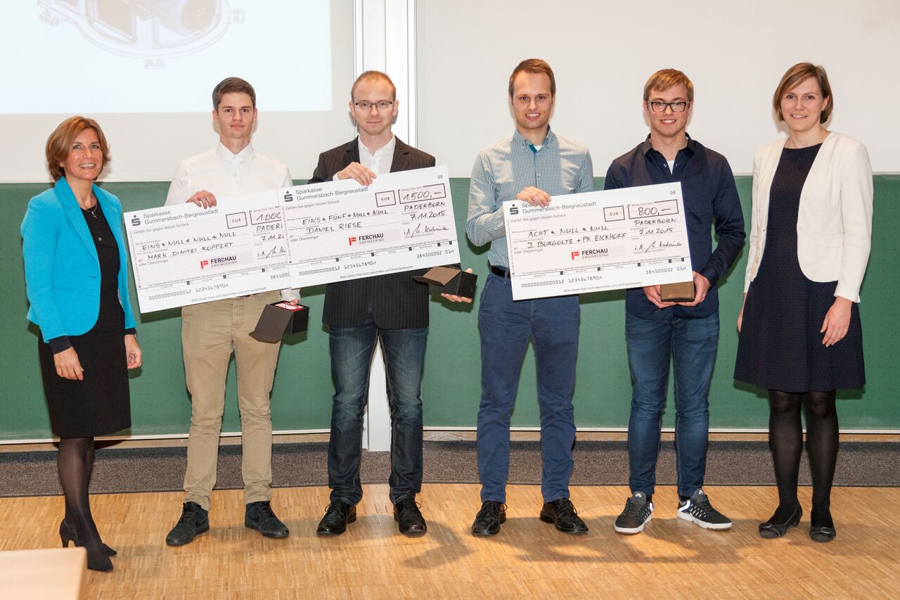 Die FERCHAU Engineering GmbH zeichnete vier Studenten der Universität Paderborn für ihre hervorragenden Leistungen aus. Daniel Riese, Mark Dimitri Koppert, Philipp Eickhoff und Jonas Borgolte wurden von Deutschlands Marktführer im Bereich Engineering für ihre erfolgreiche Teilnahme an der Übung zur Vorlesung "Maschinenelemente - Antriebstechnik" ausgezeichnet. Die Preisverleihung fand am Samstag im Rahmen der Absolventenfeier der Fakultät Maschinenbau statt. Manager Recruitment Meianie Kubina und Personalreferentin Sabrina Böhm überreichten den Preisträgern die Gesamtsumme von 3.300 Euro und die gläserne FERCHAU-Trophäe.