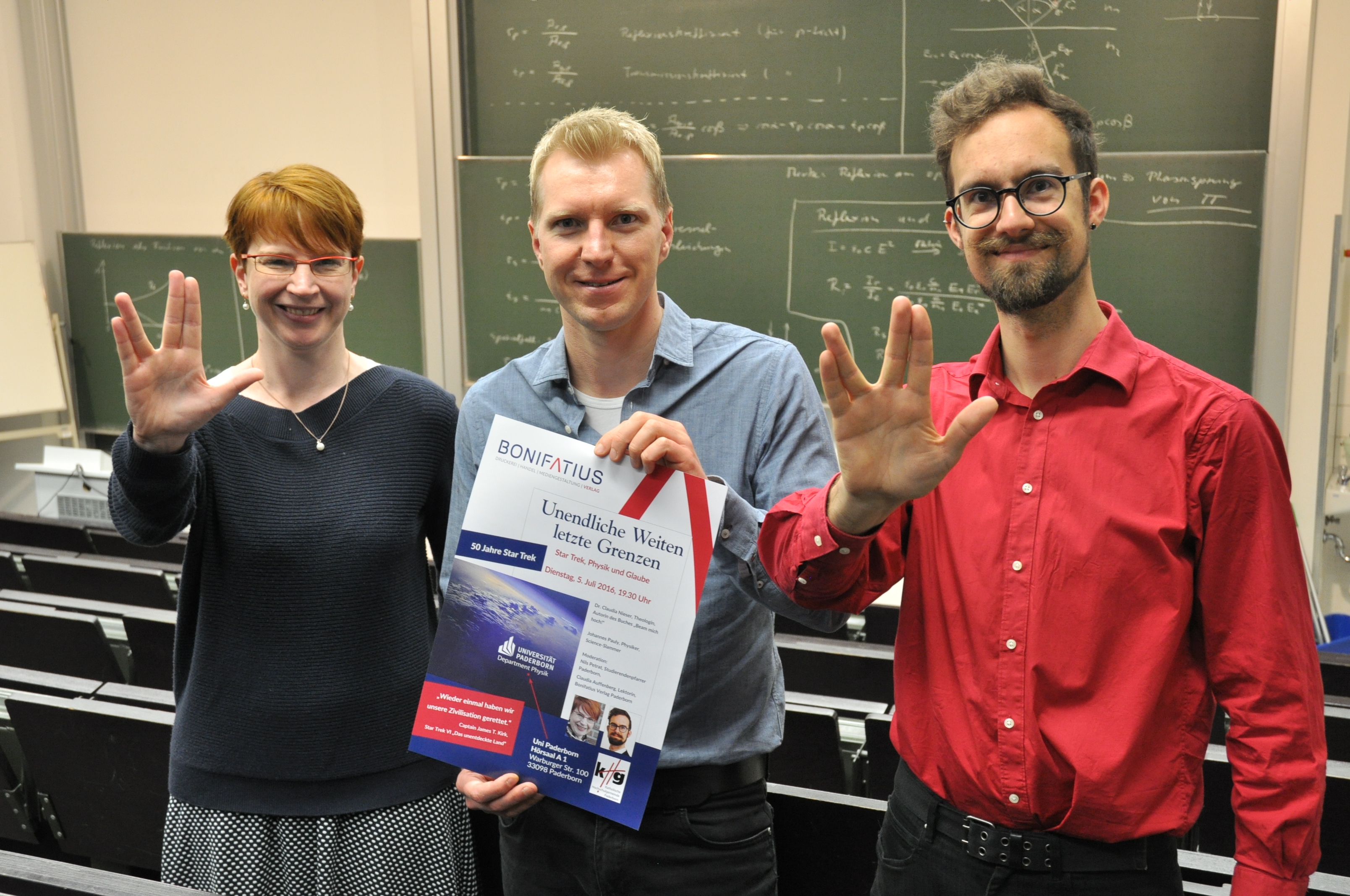 Star Trek Beyond heißt der neue Star-Trek-Film, der am 21. Juli in Deutschland in die Kinos kommt. „Beyond“ bedeutet „Jenseits“. Es stellt sich dabei die Frage, ob die unendlichen Weiten also doch letzte Grenzen haben. Um dies und mehr geht es am kommenden Dienstag um 19.30 Uhr in der Uni Paderborn, wenn im Hörsaal A1 die Theologin Dr. Claudia Nieser und der Physiker Johannes Pauly mit dem Publikum über Star Trek, Physik und Glaube diskutieren – und zwar in Wort und Experiment. Nieser und Pauly sind bekennende Fans der Serie, die in diesem Jahr ihr 50-jähriges Bestehen feiert. Die interessierte Öffentlichkeit ist eingeladen, der Eintritt frei.