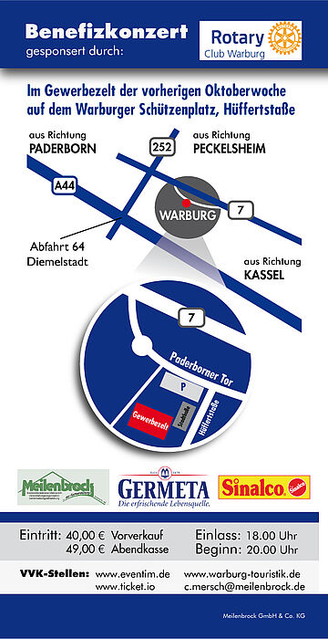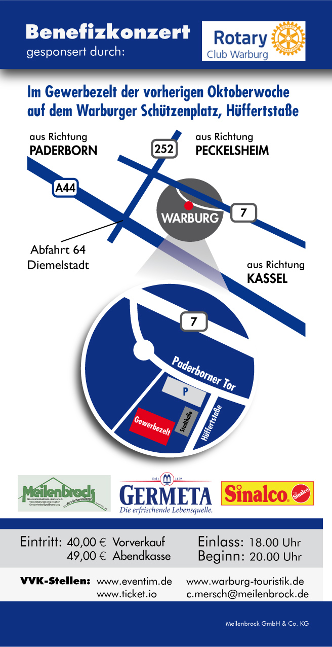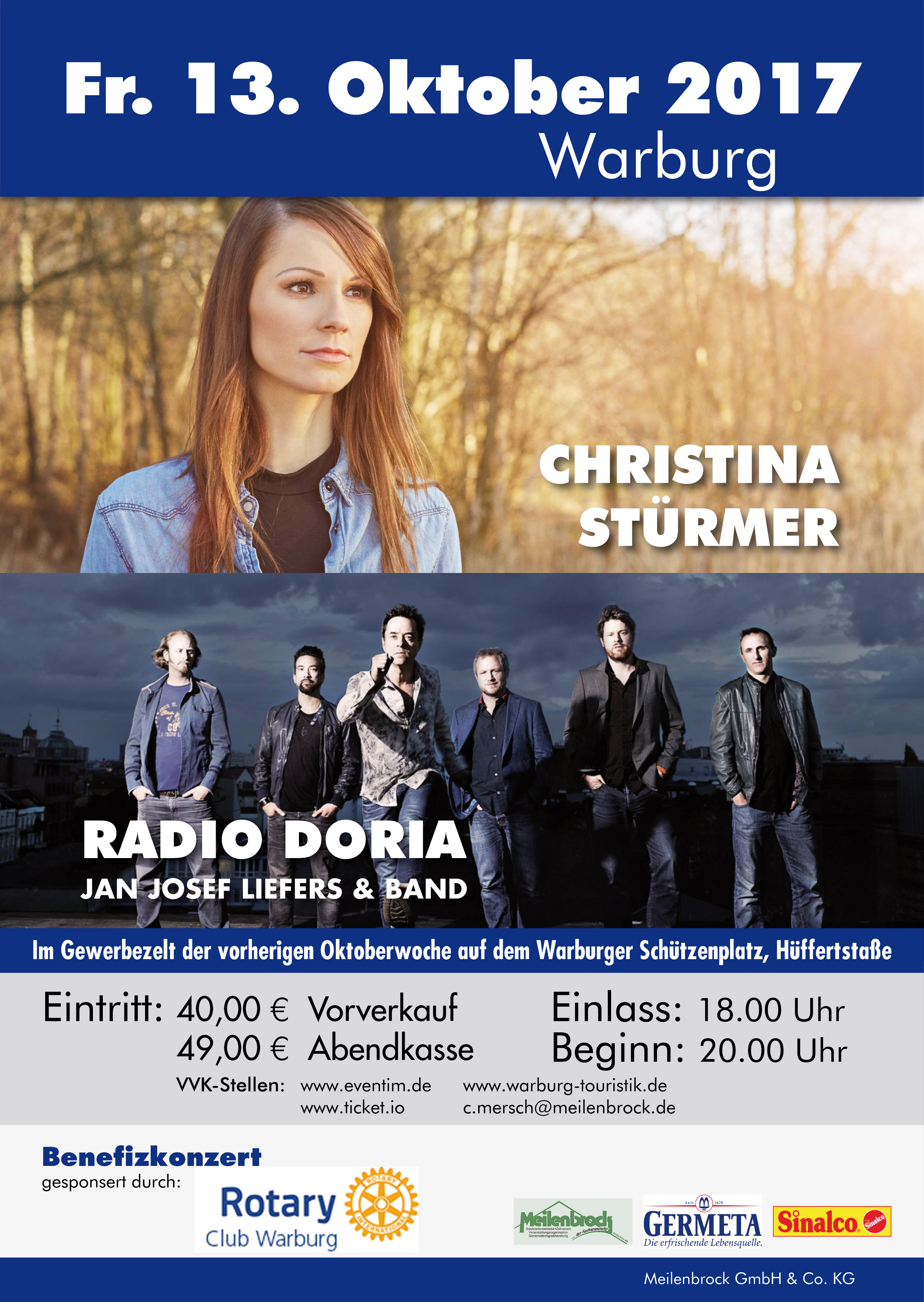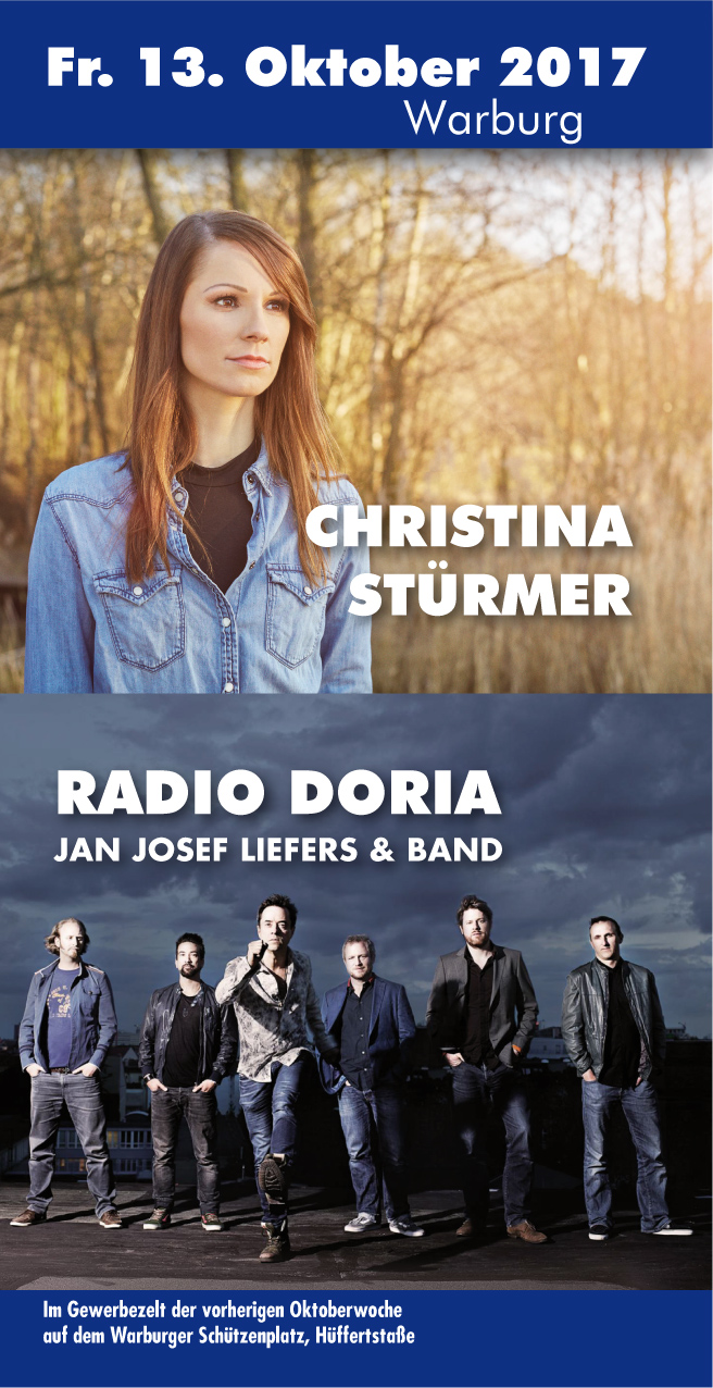 Im Rahmen eines Benefizkonzertes des Rotary Club Warburg gastieren am Freitag, 13. Oktober, zwei Top-Acts im Gewerbezelt auf dem Warburger Schützenplatz: die österreichische Pop-Rocksängerin Christina Stürmer mit ihrer international besetzten Begleitband sowie der Münsteraner Tatort-Kommissar Jan Josef Liefers (alias Prof. Boerne), ebenfalls mit seiner Band Radio Doria. Der Konzertbeginn ist um 20.30 Uhr.