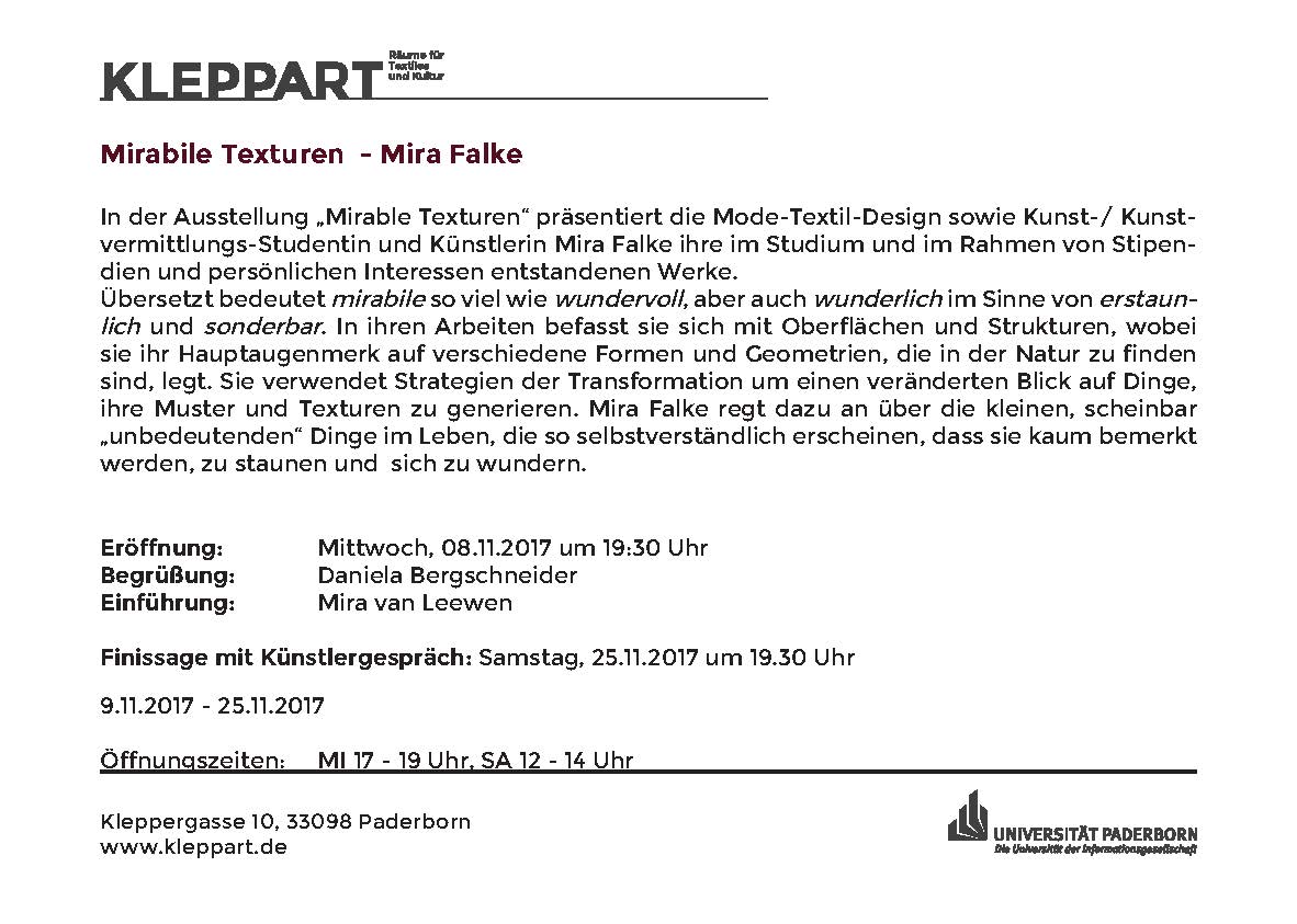 In der Ausstellung „Mirabile Texturen“ präsentiert die Mode-Textil-Design-Studentin sowie Kunst-/ Kunstvermittlungs-Studentin und Künstlerin Mira Falke ihre nicht nur im Studium an der Uni Paderborn, sondern auch im Rahmen von Stipendien und persönlichen Interessen entstandenen Werke. Die Ausstellung, die bis zum 25.11. in der KleppArt zu sehen ist, wird am 8.11. um 19.30 eröffnet.