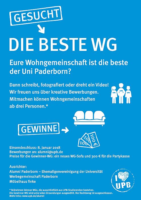 Interessierte Wohngemeinschaften können sich ab sofort per E-Mail an alumni@uni-paderborn.de bewerben oder ihren Beitrag persönlich im Alumni-Büro (Universität Paderborn, Raum A3.219) vorbeibringen. Die Bewerber sollten schreiben, warum es die eigene WG verdient hat, als beste Paderborner WG des Semesters ausgezeichnet zu werden. Teilnehmen können alle WGs, in denen mindestens drei Studierende wohnen, die an der Universität Paderborn eingeschrieben sind. Auch Fotos, Videos oder andere kreative Bewerbungen sind willkommen. Eine Jury wählt unter allen Teilnehmenden den Preisträger aus. Die Gewinner-WG erhält ein nagelneues Sofa, das vom Möbelhaus finke zur Verfügung gestellt wird. Alumni Paderborn spendiert der Gewinner-WG 300 Euro für eine WG-Party. Teilnahmeschluss ist der 8. Januar 2018. Der Rechtsweg ist ausgeschlossen.