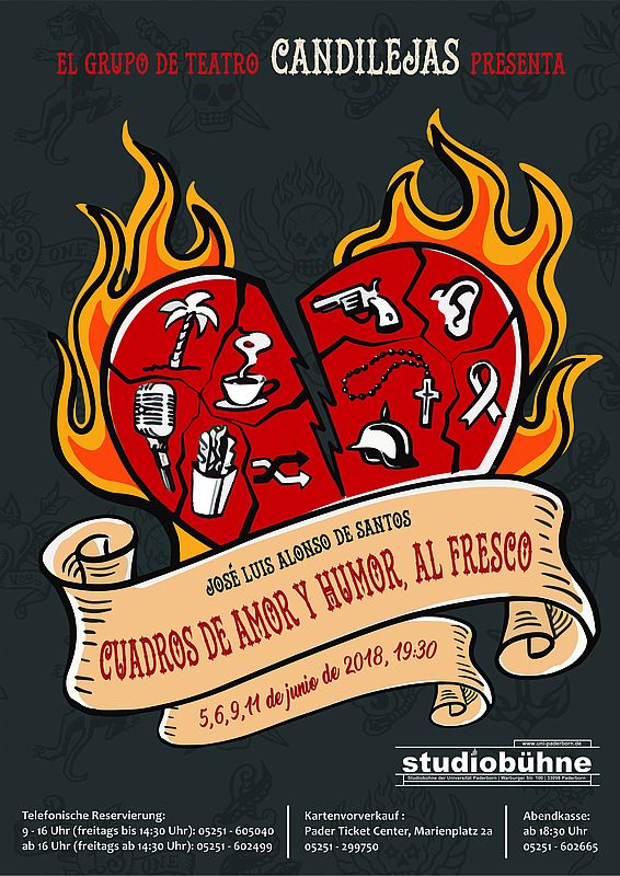 Die spanische Theatergruppe „Candilejas“ präsentiert erneut ein spanisches Theaterstück an der Studiobühne der Universität Paderborn. „Cuadros de amor y humor, al fresco“ von José Luis Alonso de Santos erzählt in mehreren Episoden Geschichten über die Liebe. In manchen Fragmenten bis zur Absurdität gesteigert, führt der Autor den Zuschauern die Abgründe der alltäglichen zwischenmenschlichen Begegnungen mit schwarzem Humor vor Augen. Aufführungen finden am 5., 6., 9. und 11. Juni statt. Premiere ist am Dienstag, 5. Juni, um 19.30 Uhr. Der Eintritt beträgt 8 Euro und ermäßigt 5 Euro für Studierende und Schüler.
