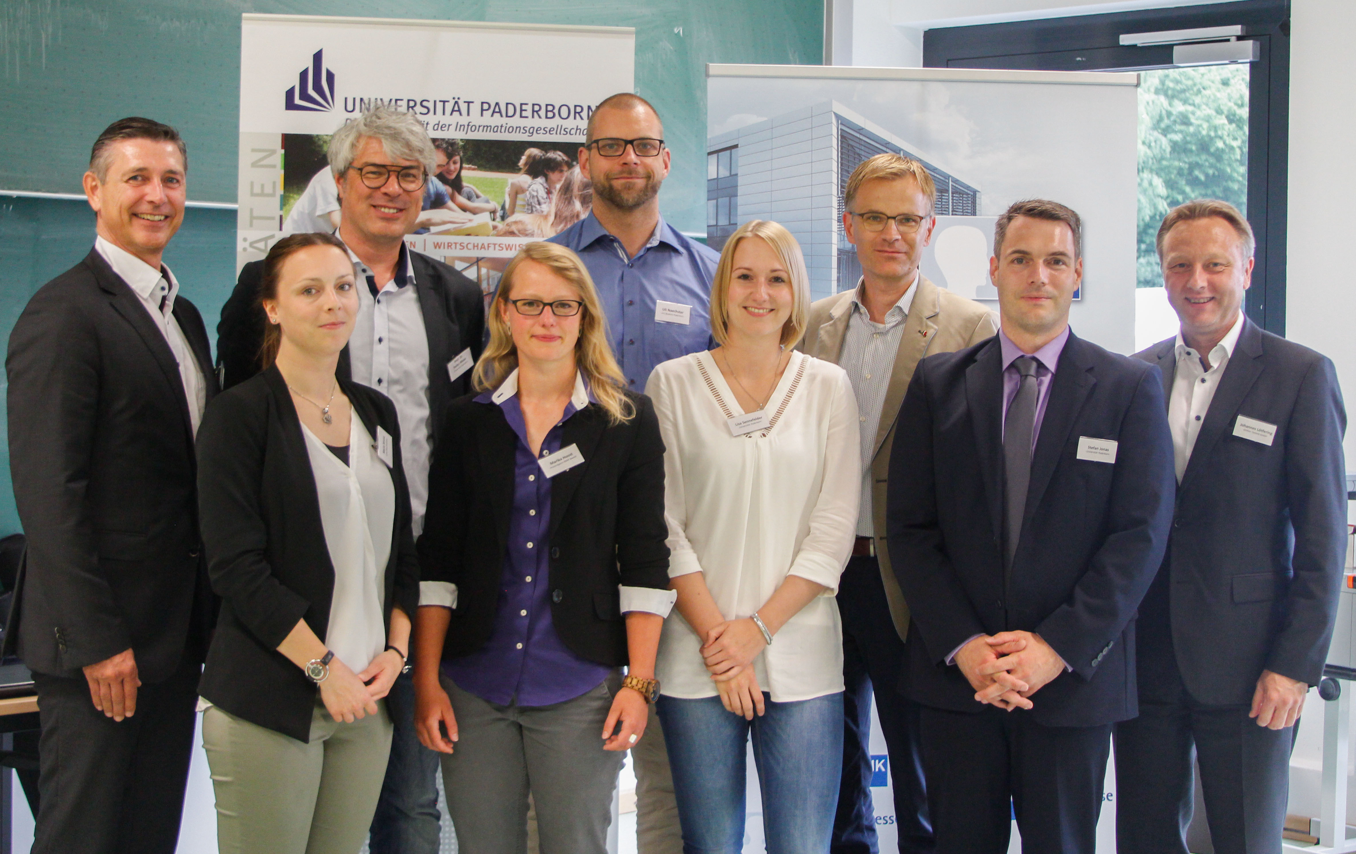 Foto (Universität Paderborn): Freuten sich über eine Veranstaltung mit Einblicken in die Praxis des betrieblichen Gesundheitsmanagements: v. l: J. Behlke (IHK OWL zu Bielefeld), M. Strunz (ELHA-Maschinenbau), Prof. Dr. H. Meier (Universität Paderborn), M. Hoost (Preisträgerin des BGM-Awards) U. Naechster (Uni Baskets Paderborn), L. Sennefelder (Universität Paderborn), Dr. M. Wrenger (Gräfliche Kliniken Bad Driburg ), S. Jonas (Universität Paderborn) und J. Lötfering (Wöhler-Technik GmbH).