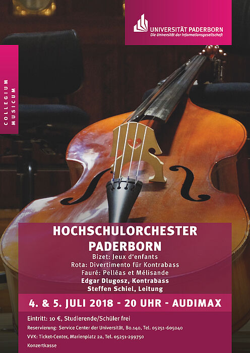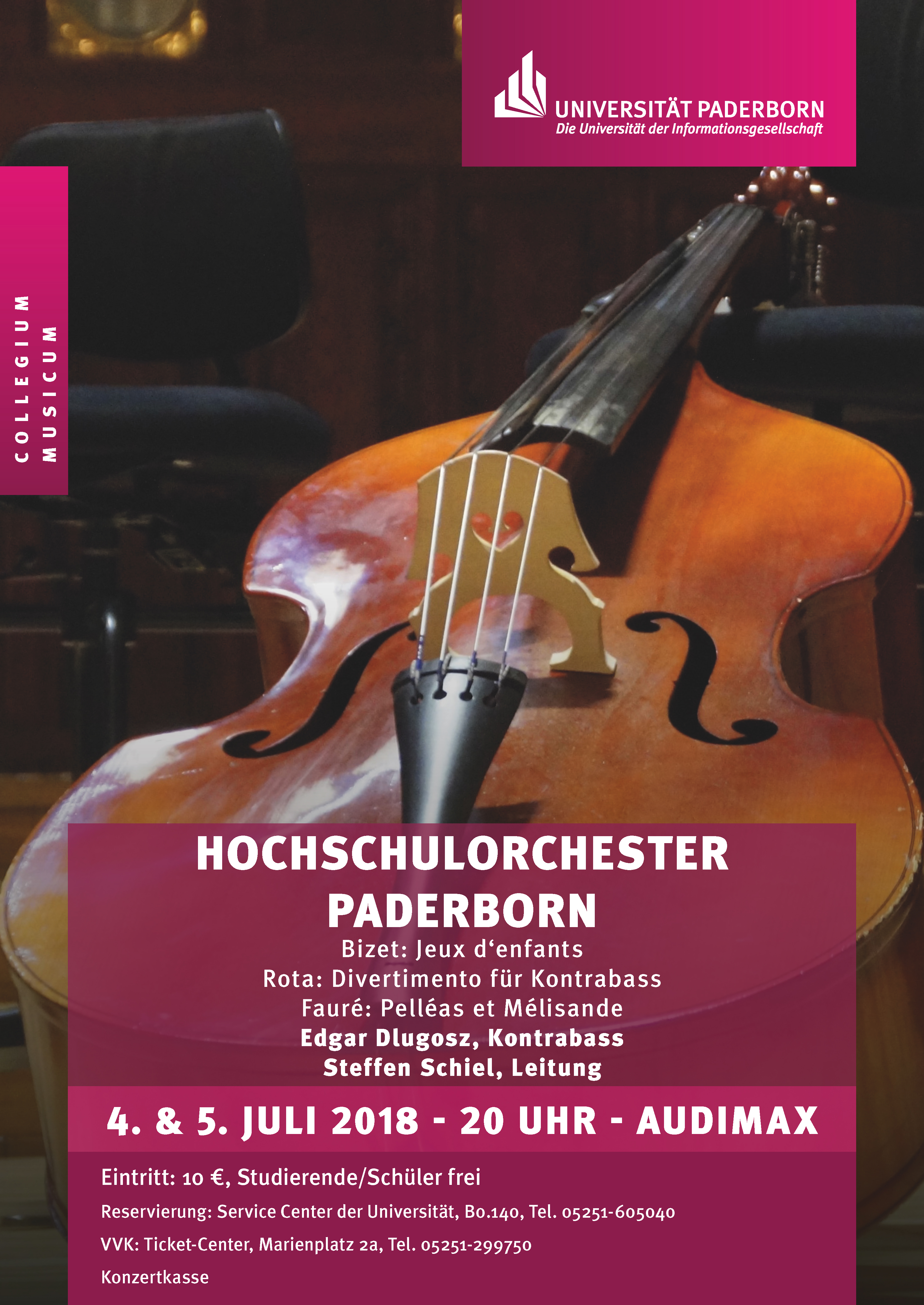 Nachdem das Hochschulorchester Paderborn im vergangenen Semester ein „Sport-Konzert“ in der Maspernhalle gespielt hat, erklingt in diesem Semester ein Kontrastprogramm zur Fußball-WM: die „Jeux d’enfants-Suite“ von Georges Bizet, Nino Rotas „Divertimento Concertante für Kontrabass und Orchester“ und die Suite „Pelléas et Mélisande“ von Gabriel Fauré. Die Konzerte finden am 4. und 5. Juli, jeweils 20 Uhr, im Audimax der Universität statt. Die Karten kosten zehn Euro, Schüler und Studierende haben freien Eintritt. Vorbestellungen: Service Center der Universität, B0.140, Tel.: 05251-605040; Vorverkauf im TicketCenter, Marienplatz 2a, Tel.: 05251-299750, Konzertkasse.