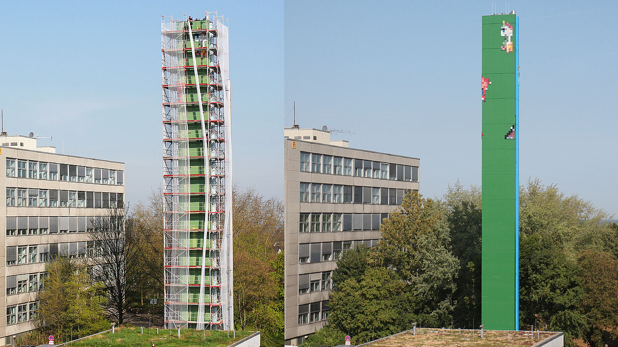 Der Schornstein der Uni-Heizzentrale erstrahlt in neuem Glanz: Die Sanierungsarbeiten wurden erfolgreich abgeschlossen. Die Heizzentrale liegt zwischen dem G-Hörsaal und dem Gebäude P1. Die Arbeiten am Schornstein umfassten u. a. die Betonsanierung, die Erneuerung des Schornsteinkranzes, den Anstrich des Schornsteins und die Instandsetzung der Unterkonstruktion der Kunstelemente. Die farbliche Gestaltung der Kunstwerke am Schornstein und an der Heizzentrale wurde 1998 von dem Kölner Künstler Bodo Schramm entwickelt.