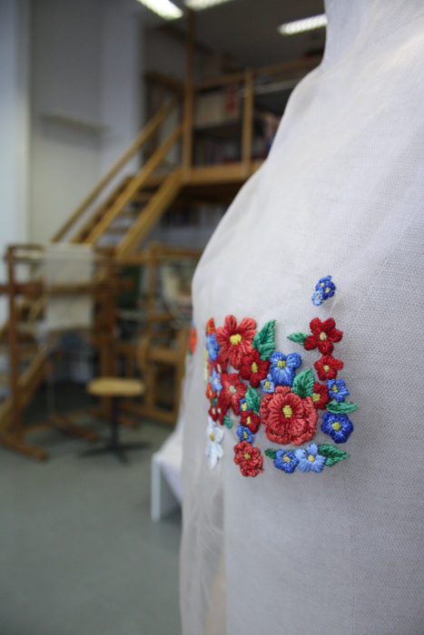 So beschäftigt sich Alicia Jablonski in ihren Werken mit Grenzgängen zwischen Realraum und Illusion, zwischen Tradition und Moderne. Durch textile und digitale Rauminstallationen setzt sie sich mit dem Erlebnisraum des Betrachters auseinander. In ihrer textilen Rauminstallation Sinnesraum 2.0 werden bei den Besuchern durch eine künstlich erzeugte textile Raumsituation alle fünf Sinne separiert angesprochen. Durch eine Projektion der Situation aus der vergangenen Siloausstellung, Silo18, erschafft sie die digitale Illusion eines Wiederauflebens dieser. Der Betrachter steht im Mittelpunkt und erlebt die im Ursprung materiell greifbare Situation hier immateriell neu. Auch ihre textilen Arbeiten hinterfragen Grenzen: von traditionellen Handarbeitstechniken und modernen Trägermaterialien. Ihr Kimono bildet ebenso wie das Oberteil Awakening eine Verbindung zwischen Tradition und Gegenwart. Moderne Shibori-Musterung verbindet sich mit dem traditionsreichen Kleidungsstück Kimono. Awakening verbindet traditionelle Handstickerei mit einem von aktuellen Kollektionen inspirierten Trägermaterial.