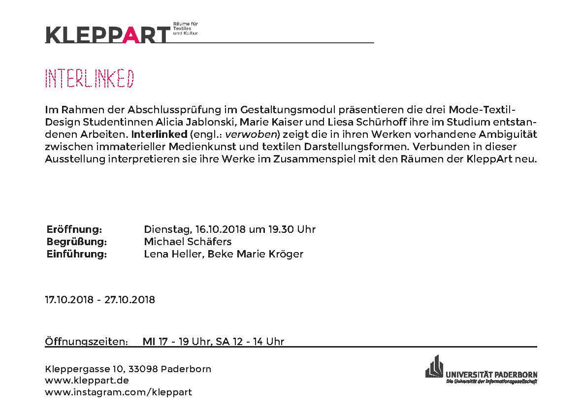 Im Rahmen der Abschlussprüfung im Gestaltungsmodul präsentieren die drei Mode-Textil-Design-Studentinnen Alicia Jablonski, Marie Kaiser und Liesa Schürhoff ihre im Studium entstandenen Werke. Interlinked (engl.: verwoben) zeigt die in ihren Arbeiten verwobene Ambiguität zwischen immaterieller Medienkunst und textilen Darstellungsformen. Verbunden in dieser Ausstellung interpretieren sie diese im Zusammenspiel mit den Räumen der KleppArt neu.