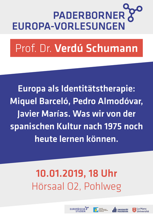 Am Donnerstag, 10. Januar 2019, referiert Prof. Dr. Daniel Verdú Schumann von der Universidad Carlos III Madrid im Rahmen der Paderborner Europa-Vorlesungen zum Thema „Europa als Identitätstherapie: Miquel Barceló, Pedro Almodóvar, Javier Marías. Was wir von der spanischen Kultur nach 1975 noch heute lernen können". Der Vortrag findet um 18 Uhr im Hörsaal O2 statt. Bei den Paderborner Europa-Vorlesungen diskutieren Experten aus der Wissenschaft und Persönlichkeiten des öffentlichen Lebens europäische Fragestellungen. Interessierte sind herzlich eingeladen.