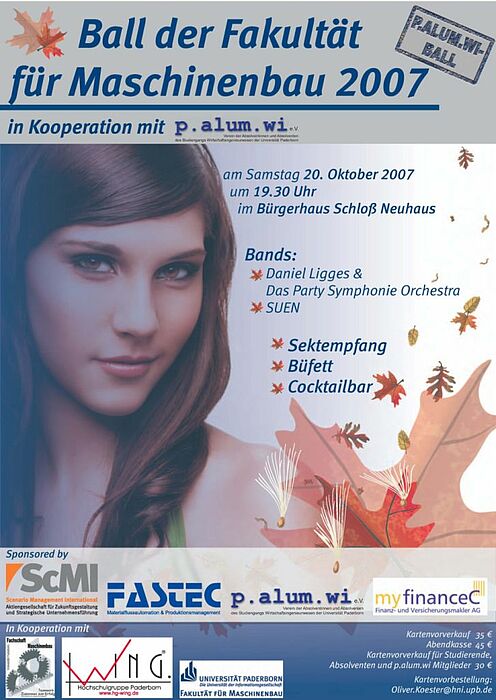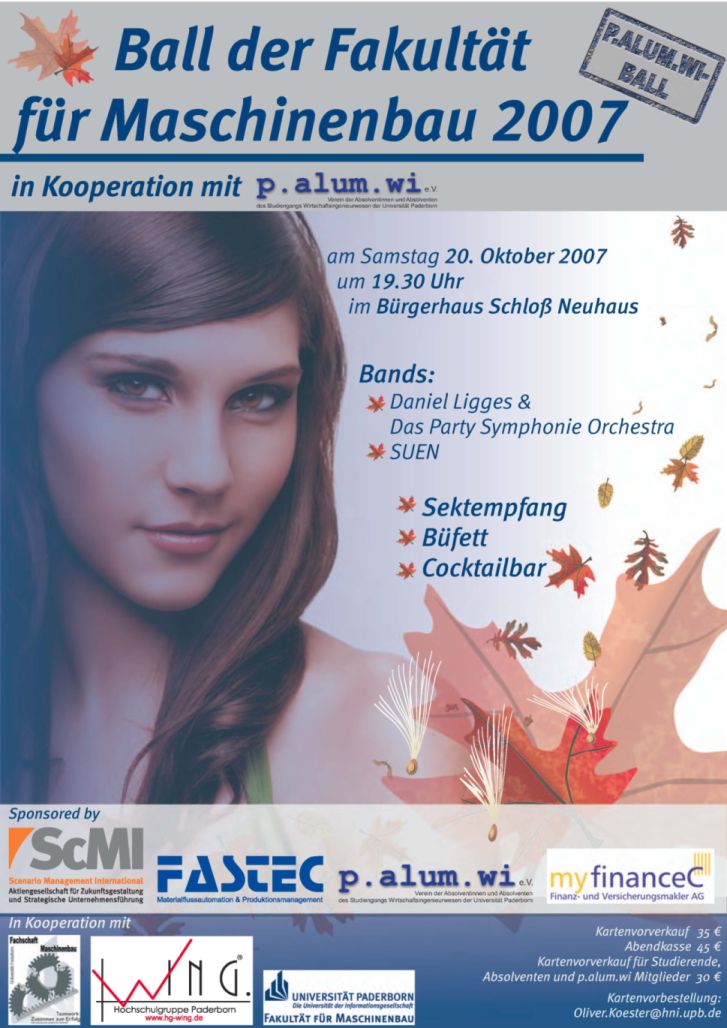 Der Countdown läuft! Am Samstag, dem 20. Oktober 2007, findet wieder der Ball der Fakultät für Maschinenbau im Bürgerhaus Schloß Neuhaus statt. Einlass ist ab 19.30 Uhr.