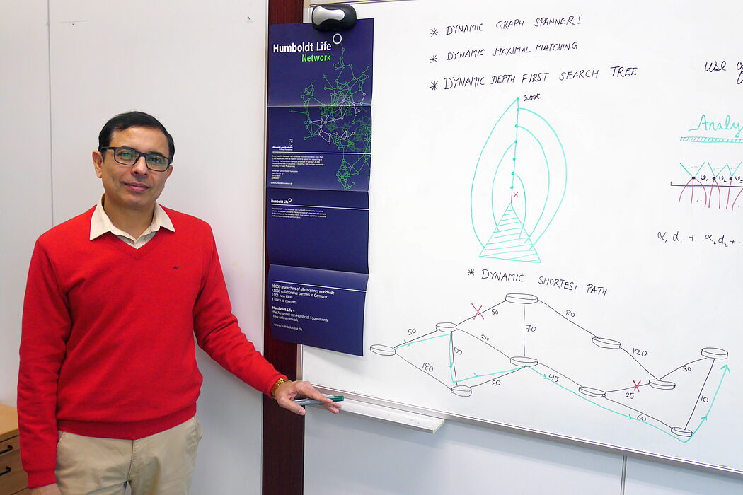 „Die guten Forschungsbedingungen und der gute Ruf der Universität – insbesondere in der Informatik – haben mich überzeugt", erklärt Baswana. Sein Forschungsgebiet sind dynamische Netzwerkalgorithmen: „Es gibt viele Netzwerke, die unser tägliches Leben beeinflussen. In sozialen Netzen sind wir zum Beispiel daran interessiert, möglichst viele Interessengruppen zu finden. Normalerweise geht man beim Entwurf eines Algorithmus für diese Fälle davon aus, dass das zugrunde liegende Netz statisch ist. Diese Annahme ist aber unrealistisch. Soziale Netze, also die Beziehungen zwischen den teilnehmenden Personen, ändern sich ständig. Das Ziel meiner Forschung ist es deshalb, ausgeklügelte Datenstrukturen für Netzwerkprobleme zu entwickeln, die sich sehr schnell an Veränderungen des Netzes anpassen.“