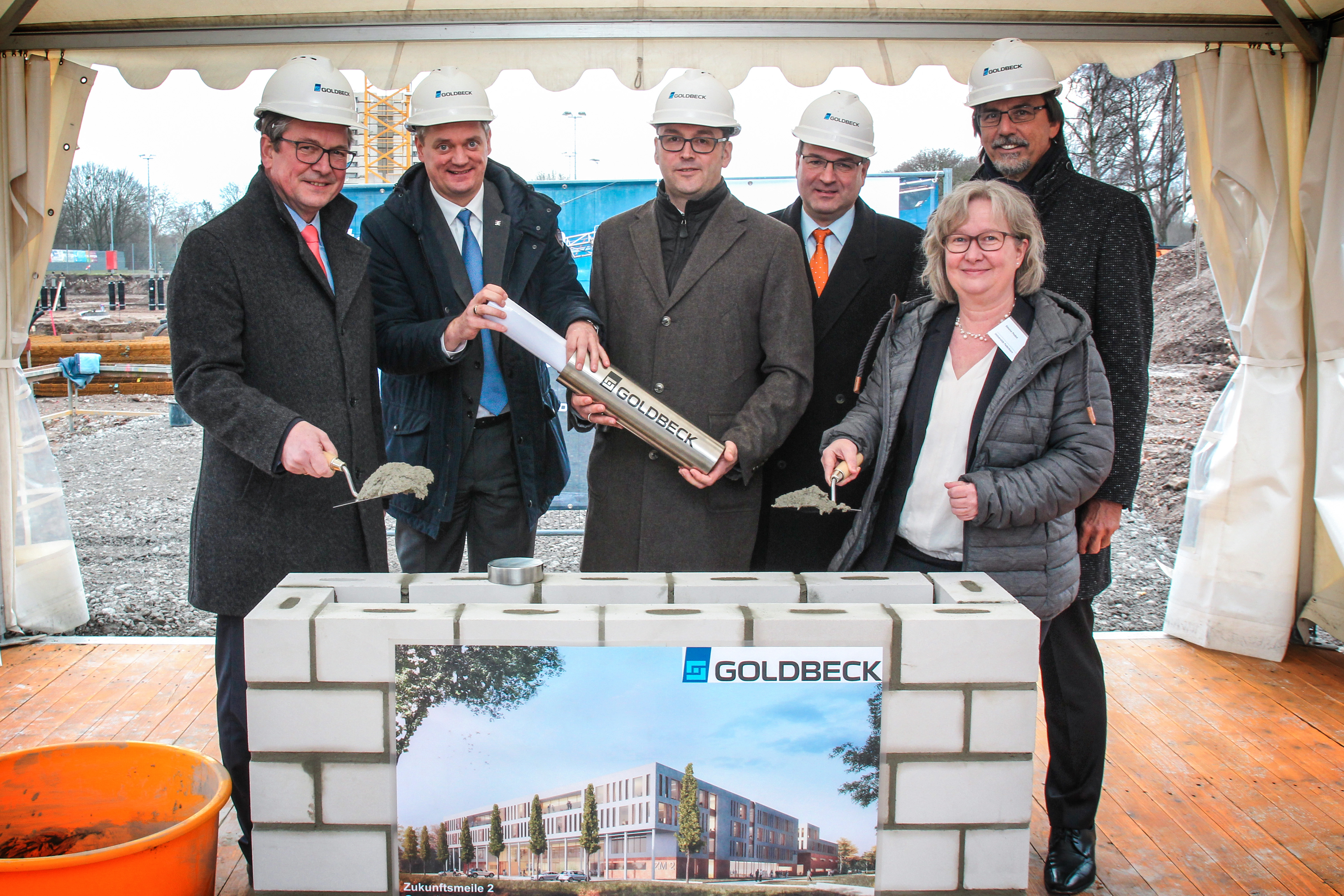 Simone Probst, Vizepräsidentin für Personal- und Wirtschaftsverwaltung der Universität Paderborn, wünschte den beteiligten Einrichtungen in ihrem Grußwort viel Erfolg und hob die Bedeutung des Baus für die Universität hervor: „Für die Universität ist es großartig, mit dieser Infrastruktur hier einen zweiten Standort zu haben und damit den Zusammenschluss von Wirtschaft und Wissenschaft weiter zu fördern.“ Michael Dreier, Bürgermeister der Stadt Paderborn, freut sich auf eine gute Zusammenarbeit und betonte: „Die Zukunftsmeile ist ein Meilenstein für die Stadt Paderborn. Es ist für den IT-Standort Paderborn ein ganz wichtiges Projekt, das 600 Arbeitsplätze schafft, wofür wir als Stadt sehr dankbar sind.“
