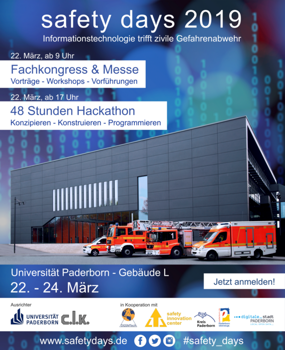 Welche Chancen und Herausforderungen bringt der Einsatz von IT in der zivilen Gefahrenabwehr mit sich? Das ist von Freitag, 22. März, bis Sonntag, 24. März, Thema der „safety days 2019“ an der Universität Paderborn. Die Veranstaltung wendet sich sowohl an Entscheidungsträger und Einsatzkräfte der zivilen Gefahrenabwehr als auch an IT-Profis und -Amateure sowie Forscher, Studierende und die interessierte Öffentlichkeit. Teil der „safety days“ sind ein Fachkongress mit bundesweiten Experten, eine Messe sowie ein „48 Stunden Hackathon“, bei dem Teams IT-Lösungen für die zivile Gefahrenabwehr erarbeiten sollen. Schirmherr der Veranstaltung ist Prof. Dr. Andreas Pinkwart, Minister für Wirtschaft, Innovation, Digitalisierung und Energie des Landes NRW. Veranstaltungsort ist das Universitätsgebäude L am Pohlweg. Interessierte können sich für den Fachkongress und den Hackathon noch unter www.safetydays.de anmelden.