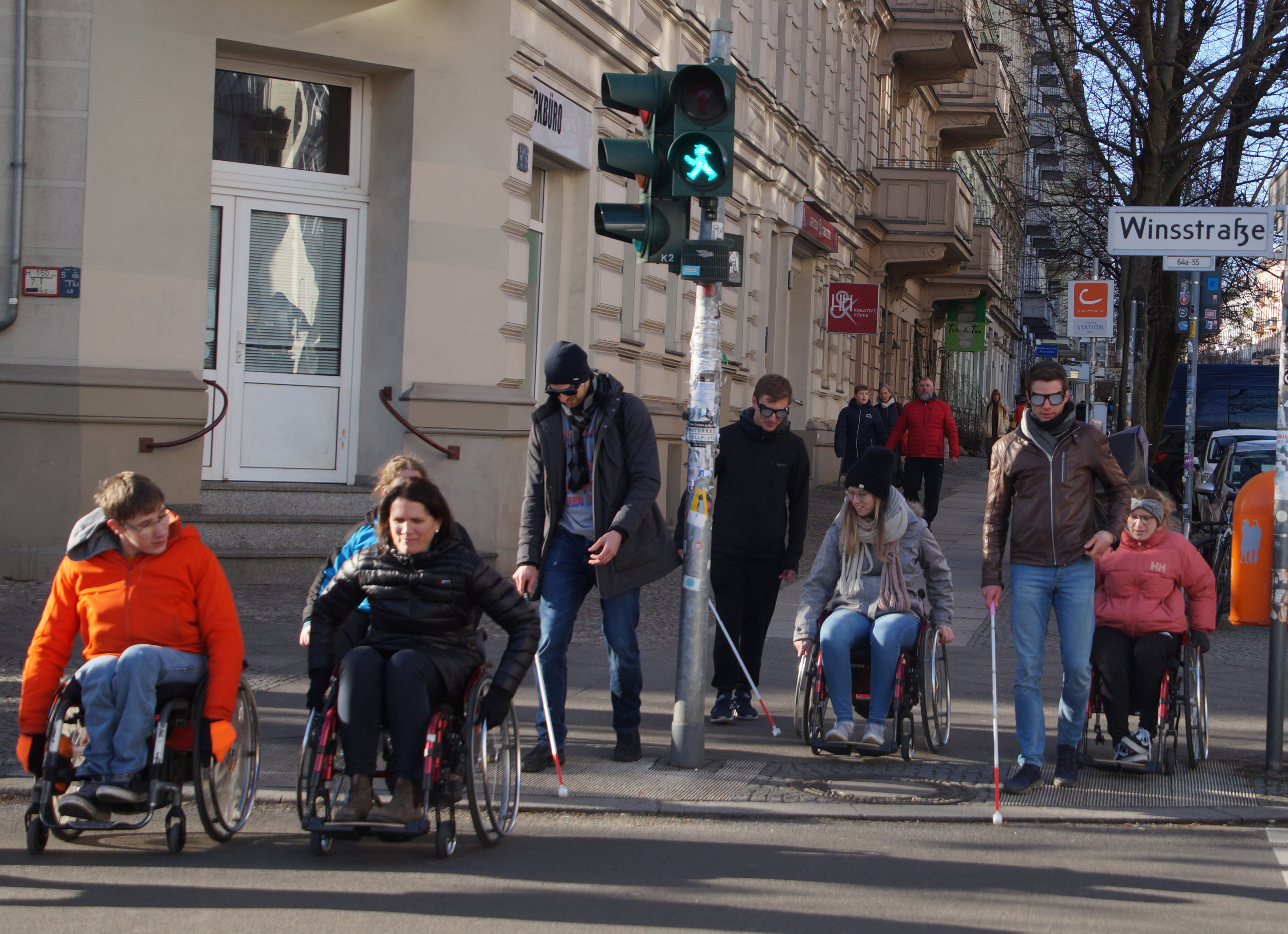 Menschen, die auf einen Rollstuhl angewiesen sind oder eine stark eingeschränkte Sehfähigkeit haben, stoßen im Alltag auf viele Hürden: Bordsteine, die kaum zu überwinden sind, oder stille Fußgängerampeln, die allein durch Lichtzeichen funktionieren. Während einer mehrtägigen Exkursion versetzten sich nun Sportstudierende der Universität Paderborn in die Lage der Betroffenen und erkundeten auf Rollstühlen und mit Blindenbrillen den Prenzlauer Berg in Berlin. Prof. Dr. Sabine Radtke, Leiterin der AG Inklusion im Sport am Departement Sport und Gesundheit der Universität Paderborn, organisierte die Exkursion.