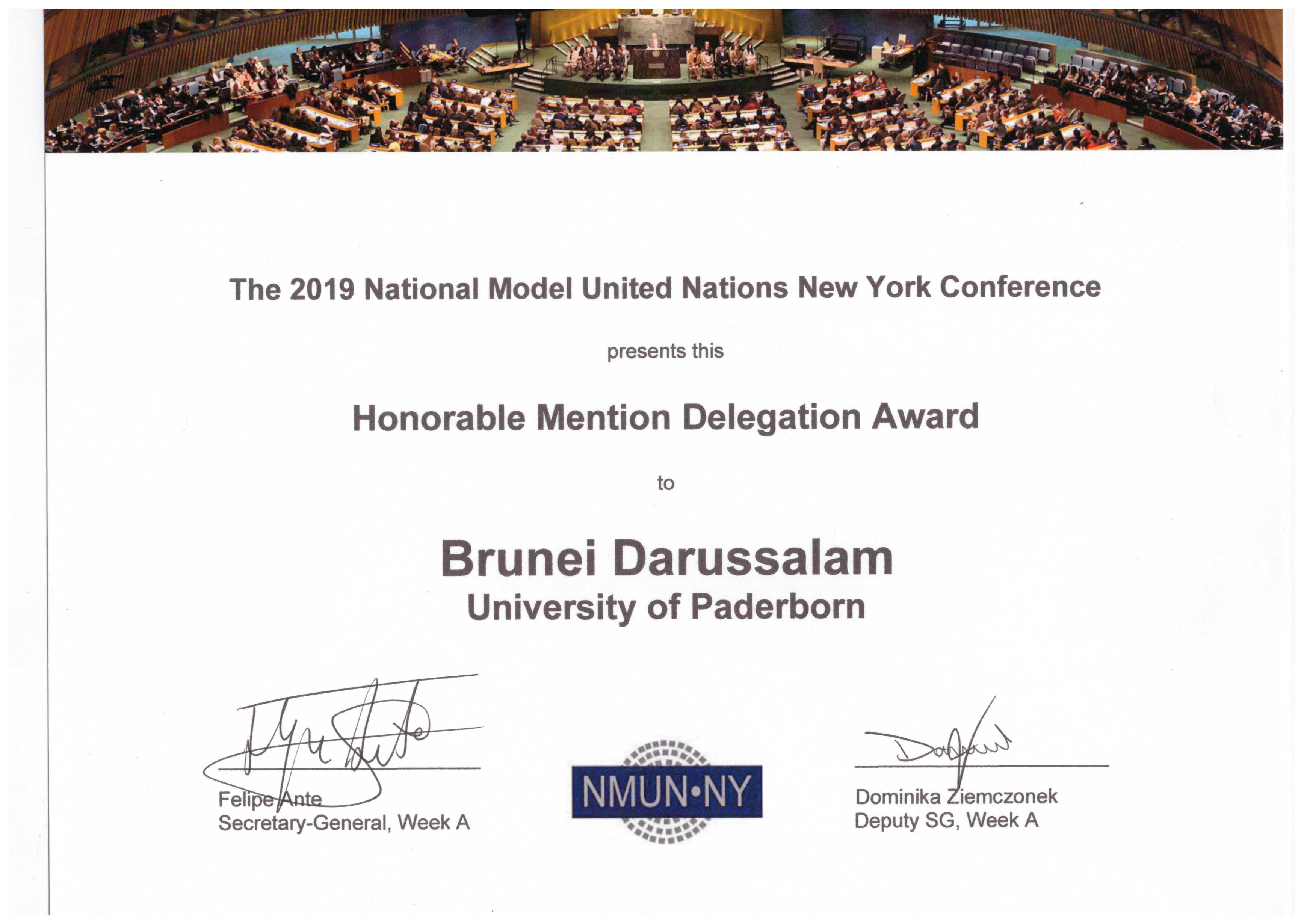 Bei der weltweit größten MUN Konferenz in New York vertraten die Paderborner Delegierten das Land Brunei Darussalam, ein vergleichsweise kleines südostasiatisches Land, das zum Zeitpunkt der Konferenz mit dem Gesetz gegen Homosexuelle in die Schlagzeilen weltweit geriet. Unsere Studierenden meisterten die Herausforderung ein so kontroverses Land zu vertreten mit Bravour und bewiesen diplomatisches Können, politisches Verständnis und vor allem starke Nerven.