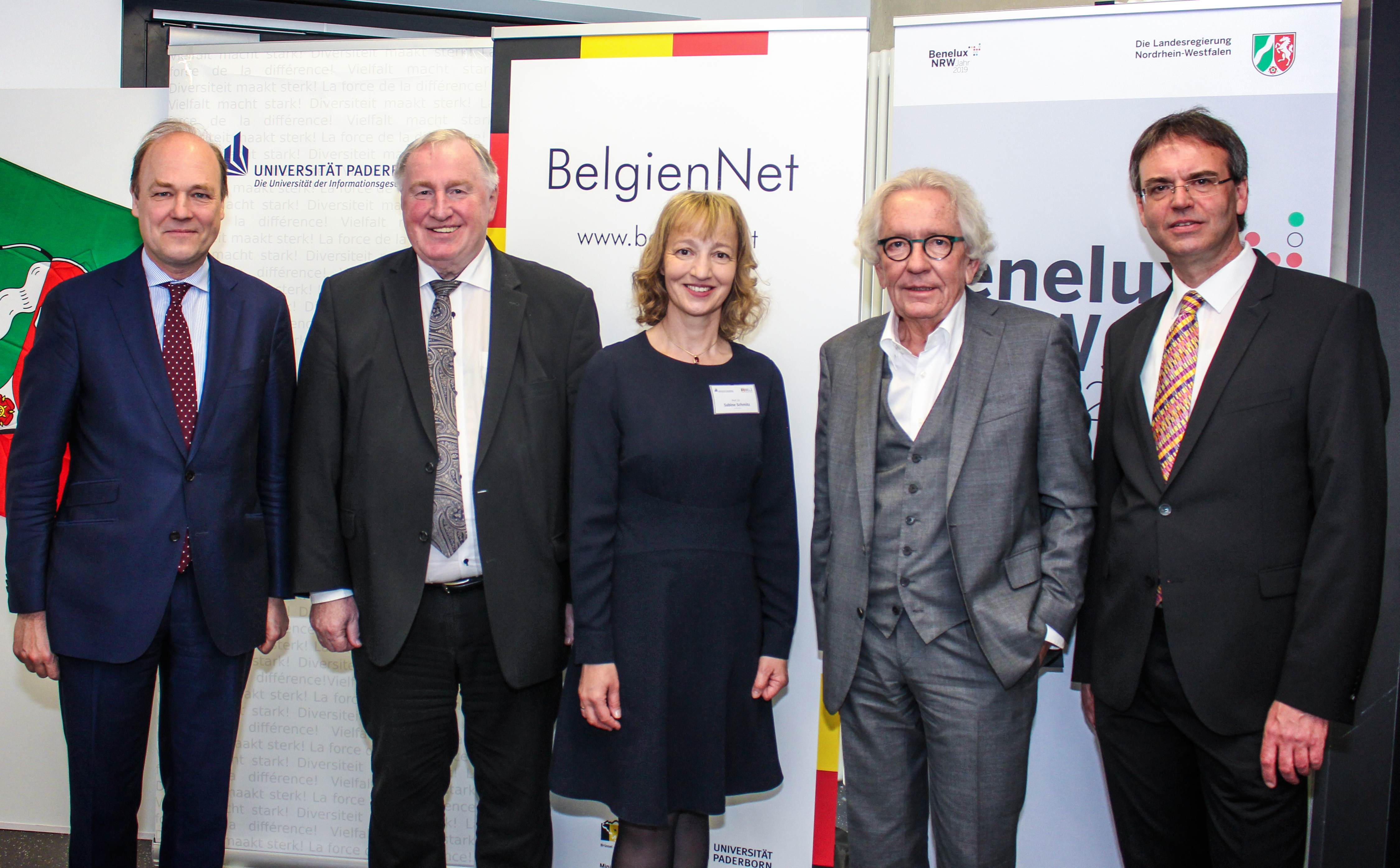Am Mittwoch waren Vertreter des Königreichs Belgien, der Landesregierung NRW und des EU-Parlaments zu Gast an der Universität: Willem van de Voorde, Botschafter des Königreichs Belgien in Deutschland, Dr. Stephan Holthoff-Pförtner, Minister für Bundes- und Europaangelegenheiten des Landes NRW, Elmar Brok, Mitglied des EU-Parlaments, Karl-Heinz Lambertz, Präsident des Ausschusses der Regionen der EU, und Prof. Dr. Christian Behrendt, Staatsrechtler der Université de Liège und der KU Leuven, debattierten über das Thema „Belgien und NRW – von Nachbarn zu Partnern im Euregioverbund“.