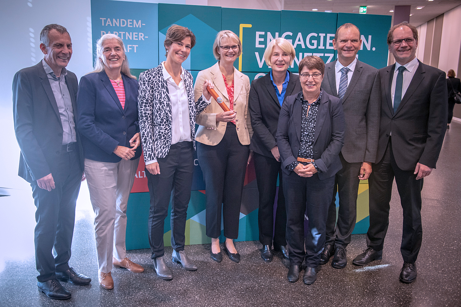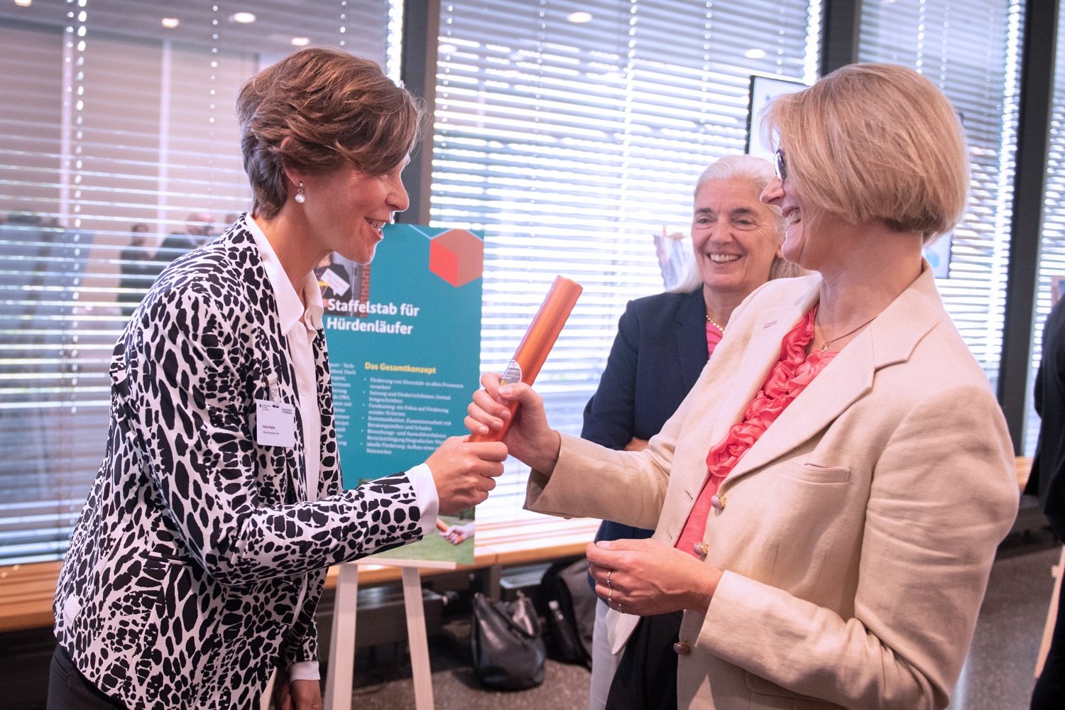 „Neben Leistung und Engagement ergeben sich aus den individuellen Lebenswegen der Studierenden weitere wichtige Förderkriterien. Sie müssen bei der Stipendienvergabe berücksichtigt werden und noch stärker ins allgemeine Bewusstsein rücken“, erläutert Volker Meyer-Guckel, stellvertretender Generalsekretär des Stifterverbandes. „Auch die Stiftung Studienfonds OWL hat hier bereits zahlreiche sehr gut funktionierende Verfahren zur Auswahl und Förderung von Studierenden entwickelt, die in ihrem Leben so mache Hürde meistern mussten.“ Der Wettbewerbsbeitrag der Stiftung Studienfonds OWL trug den Titel „Ein Staffelstab für Hürdenläufer“. Im Rahmen der Wettbewerbsausstellung überreichte Studienfonds-Geschäftsführerin Katja Urhahne der Bundesministerin symbolisch einen Staffelstab.