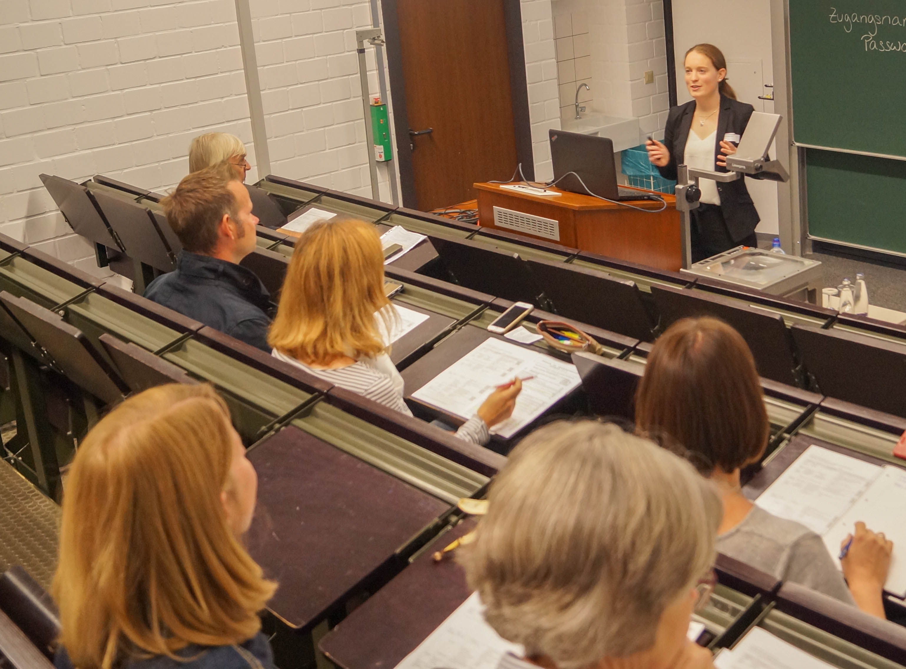 Foto (PLAZ, Björn Heerdegen): Christine Adammek (vorn) stellte in ihrem Workshop motivierende Lernzugänge durch neue Medien im Französischunterricht vor.