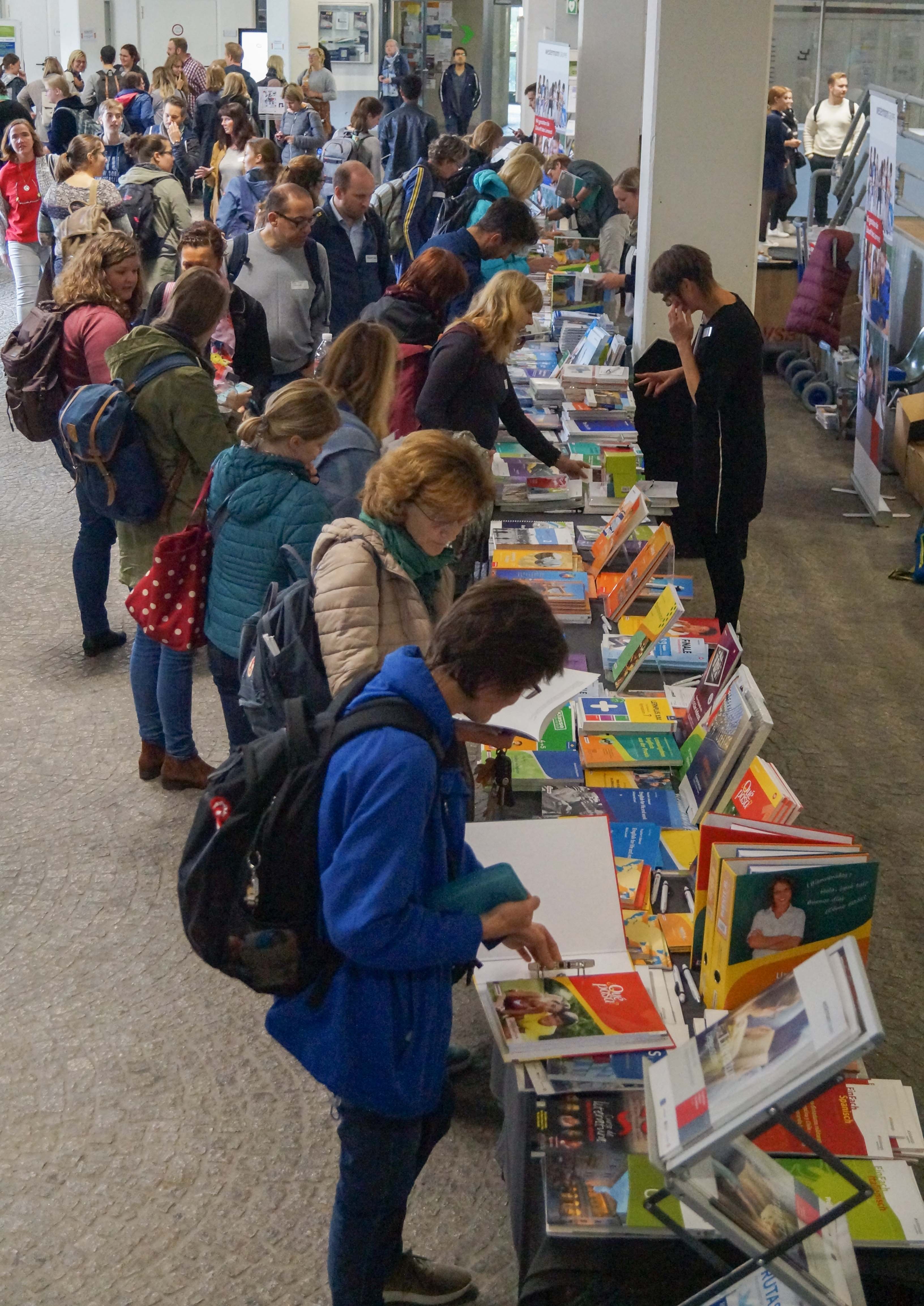 Foto (PLAZ, Björn Heerdegen): Die Buch- und Medienausstellung im Foyer lockte viele Besucher*innen an.
