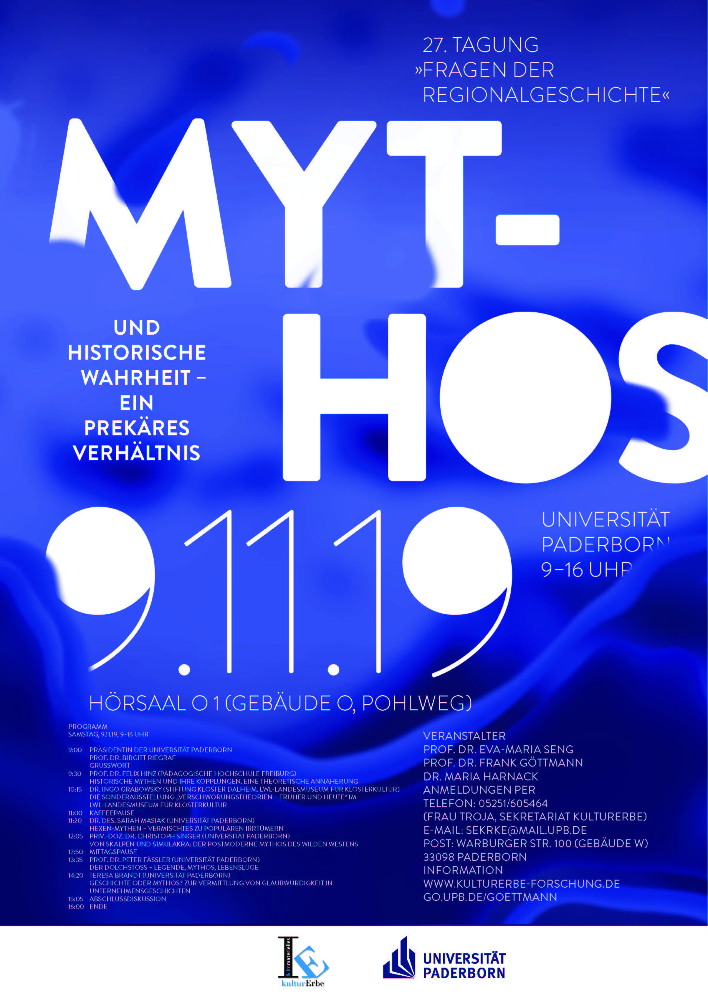 Nach einer grundlegenden Einführung in das Thema „Historische Mythen“ durch Prof. Dr. Felix Hinz, Pädagogische Hochschule Freiburg, stellt Dr. Ingo Grabowsky, Stiftung Kloster Dalheim. LWL-Landesmuseum für Klosterkultur, die im Museum Dalheim gezeigte Sonderausstellung über „Verschwörungstheorien“ vor. Den in populärer Wahrnehmung und Forschung durch mancherlei Irrtümer geprägten „Hexen-Mythen“ widmet sich Dr. Sarah Masiak, Universität Paderborn, dem „Mythos Wilder Westen“ Privatdozent Dr. Christoph Singer, ebenfalls Universität Paderborn. Die aus den Geschichtsbüchern vertraute „Dolchstoßlegende“ über das „im Felde unbesiegte“ deutsche Heer, die bekanntlich nach dem Ersten Weltkrieg Politik und Gesellschaft gespalten hat, analysiert der Paderborner Prof. Dr. Peter Fäßler, bevor Teresa Brandt, auch Universität Paderborn, unter dem Titel „Geschichte oder Mythos?“ der Frage der Glaubwürdigkeit in der Unternehmensgeschichtsschreibung nachgeht.