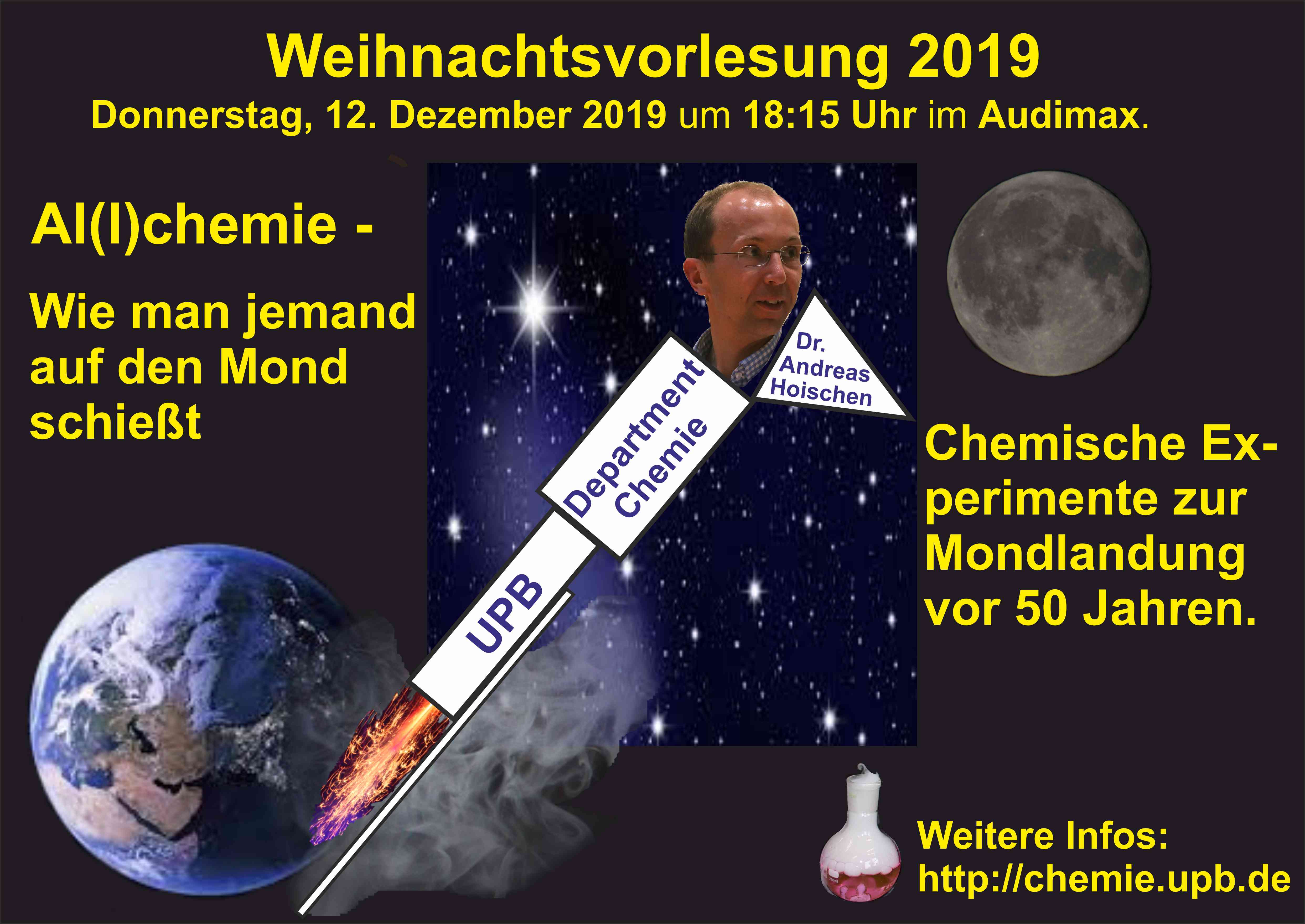 Vor 50 Jahren landeten mit Neil Armstrong und Buzz Aldrin erstmals Menschen auf dem Mond. Passend dazu drehen sich die spannenden Experimente der diesjährigen Weihnachtsvorlesung von Dr. Andreas Hoischen am Donnerstag, 12. Dezember, rund um dieses Thema. Der Ausflug in die Al(l)chemie startet um 18.15 Uhr im Audimax der Universität Paderborn. Der Eintritt ist frei.