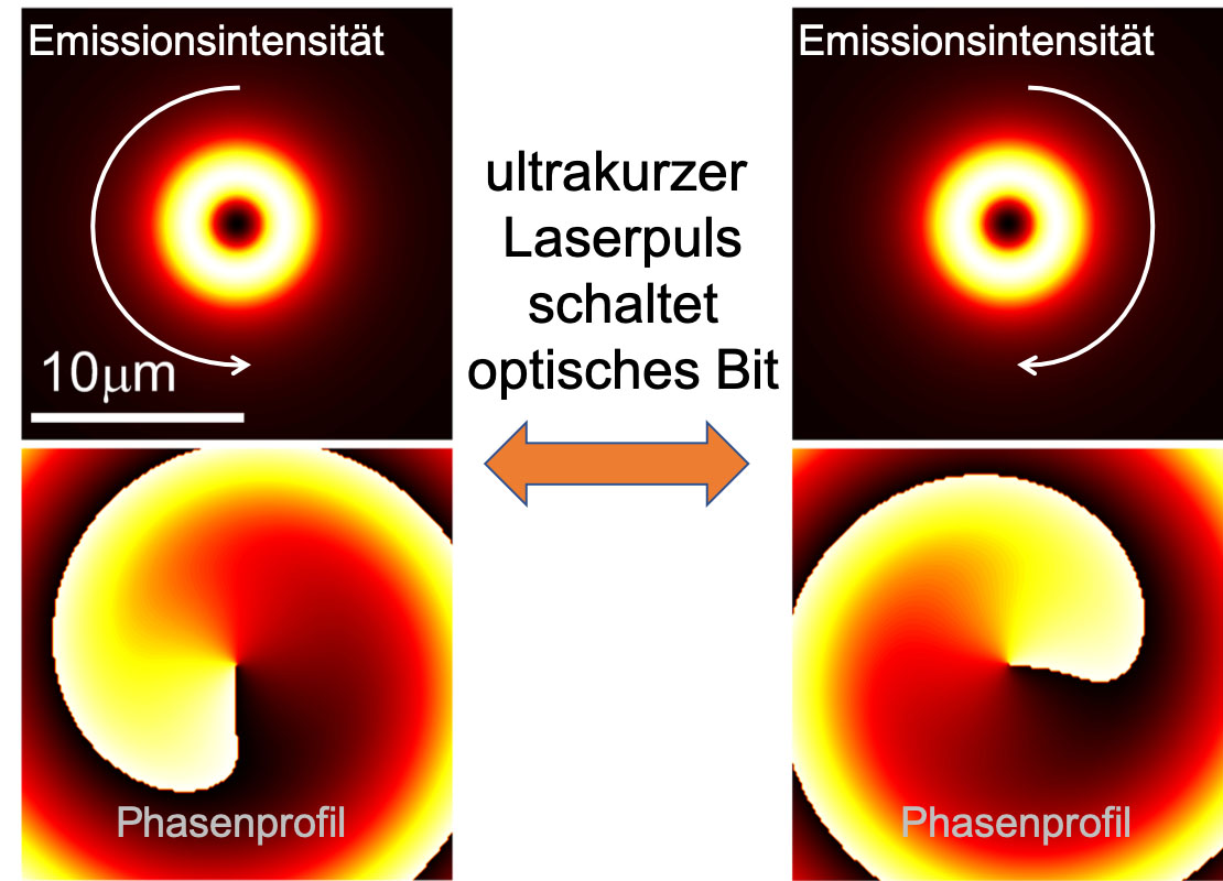In der aktuellen Arbeit untersucht das Projektteam um die Paderborner Physiker Prof. Dr. Stefan Schumacher und Dr. Xuekai Ma sowie Jun.-Prof. Marc Aßmann und Bernd Berger von der TU Dortmund bestimmte Wirbelzustände, die sich in einer optisch angeregten Quantenflüssigkeit ausbilden. „Diese Wirbel können in zwei verschiedene Richtungen rotieren. Die beiden Drehrichtungen entsprechen den Einstellungen eines Bits, also Eins oder Null“, erklärt Studienleiter Schumacher. Der Wissenschaftler ergänzt: „Die Anregung erfolgt mit einem ringförmigen Laserprofil, in dessen Mitte sich ein Wirbel in der vom Laser angeregten Quantenflüssigkeit ausbildet. Ein zusätzlicher kurzer Laserpuls bewirkt dann das Umschalten der Drehrichtung, sodass das Bit gezielt entweder auf Null oder auf Eins eingestellt und auch nachträglich umgeschaltet werden kann.“ Mit dem gezielten Umschalten können dann auch gespeicherte Informationen besonders schnell geändert werden, so der Physiker weiter.