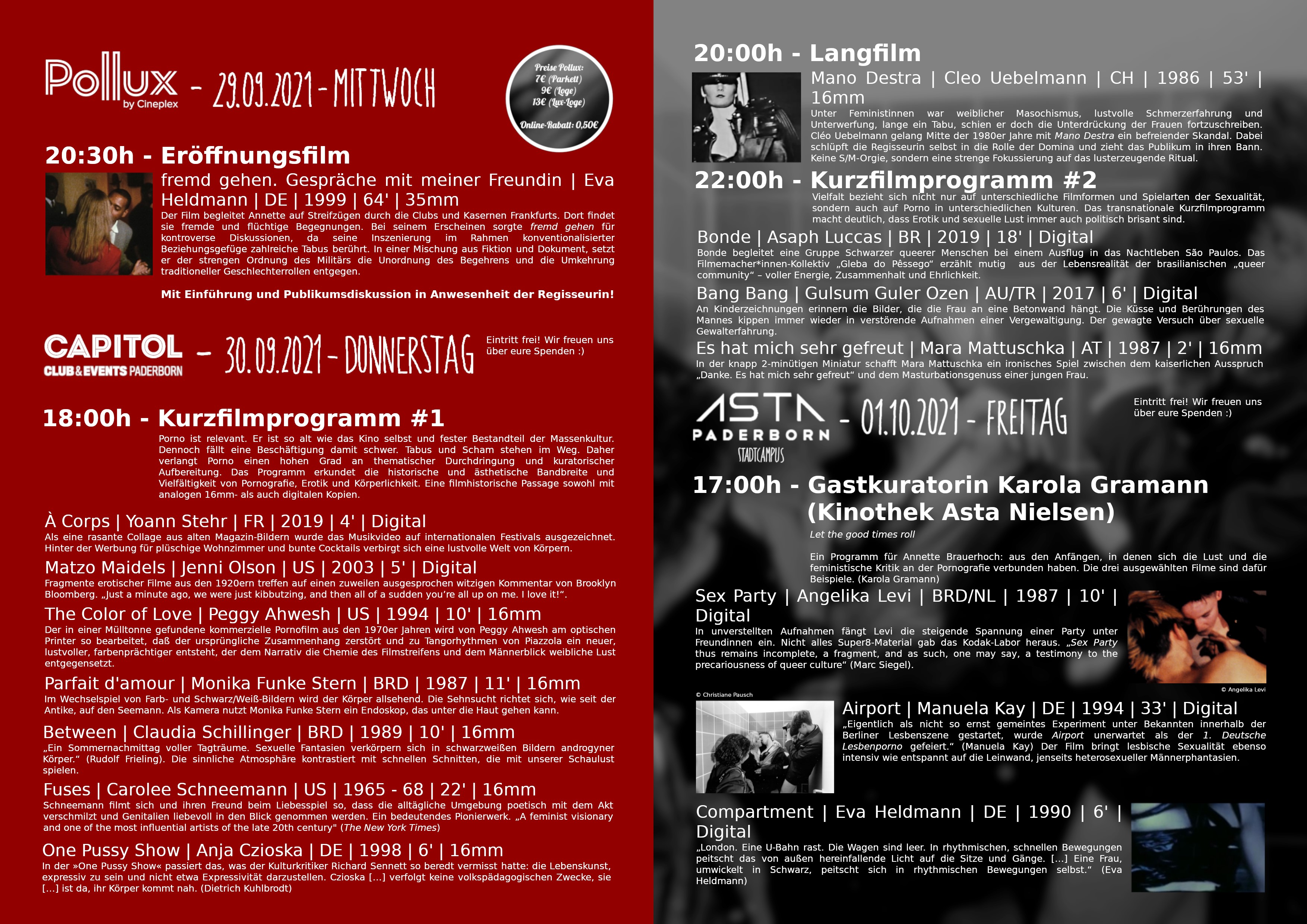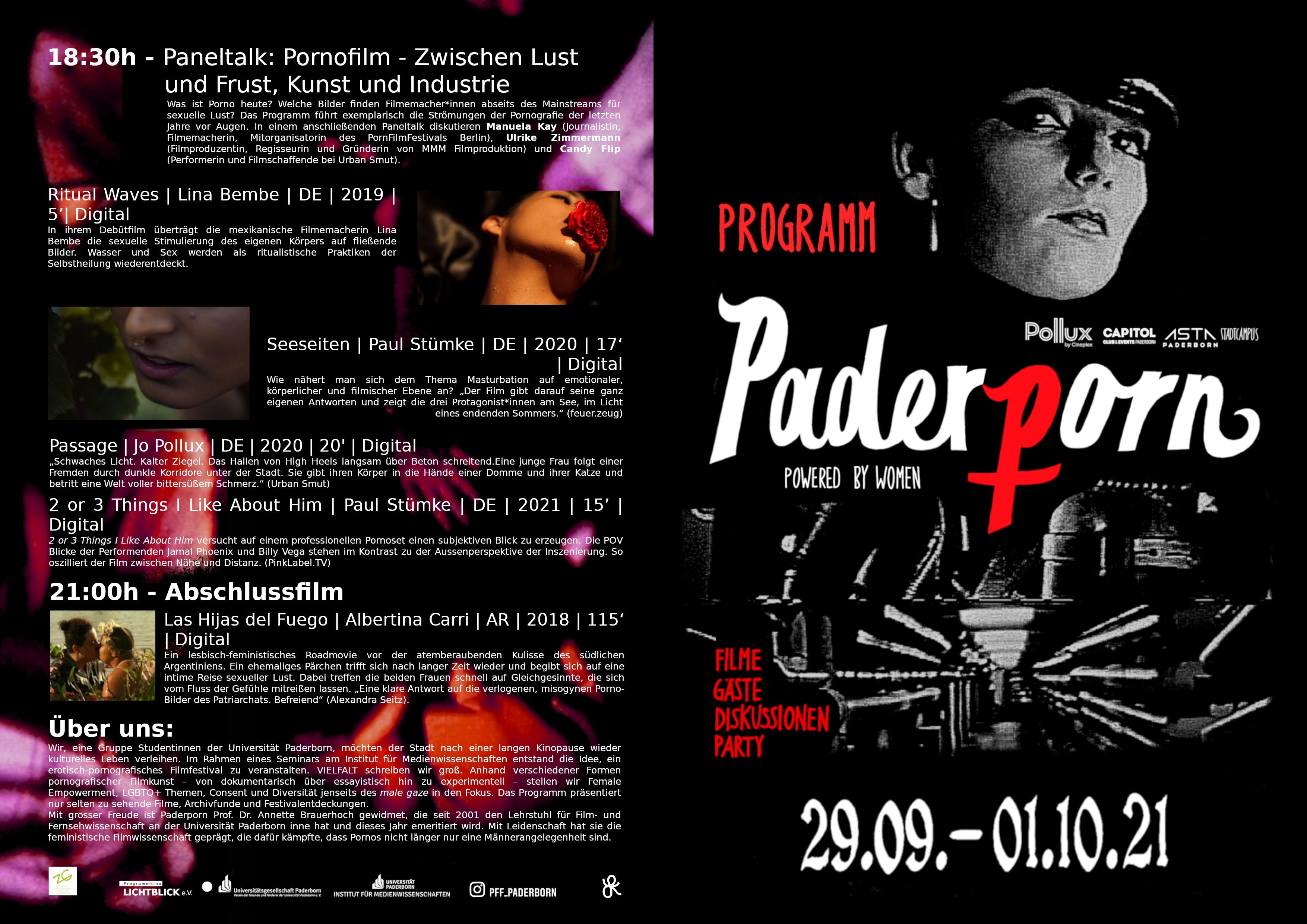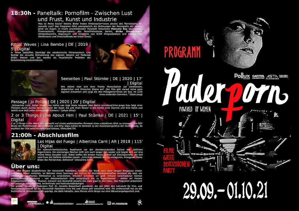 Am 29. September zeigt das Pollux-Kino um 20.30 Uhr in Anwesenheit der Regisseurin Eva Heldmann den Eröffnungsfilm „Fremd gehen. Gespräche mit meiner Freundin“ (1999). Im Anschluss findet eine Diskussion mit dem Publikum statt. Am 30. September können Interessierte ab 18 Uhr im Paderborner CAPITOL verschiedene Kurz- und Langfilme sehen. Zum Abschluss des Festivals am 1. Oktober findet im AStA Stadtcampus nach einem Kurzfilmprogramm (17 Uhr), das die Filmwissenschaftlerin Karola Gramann kuratiert hat, ab 18.30 Uhr eine Podiumsdiskussion mit dem Titel „Pornofilm – Zwischen Lust und Frust, Kunst und Industrie“ statt. Geladen sind Manuela Kay (Autorin, Filmemacherin und Mitorganisatorin des PornFilmFestivals Berlin), Ulrike Zimmermann (Filmproduzentin, Regisseurin und Gründerin von MMM Filmproduktion) und Candy Flip (Performerin und Filmschaffende bei Urbansmut). Gemeinsam soll u. a. über die Inszenierung von Tabuthemen und Sexualität im Film sowie über die gesellschaftliche Relevanz von Pornografie, nicht zuletzt für Frauen und Filmemacherinnen, diskutiert werden. Im Anschluss folgen weitere Kurzfilme.