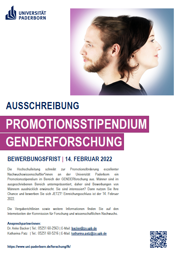 Die Hochschulleitung schreibt zur Promotionsförderung besonders qualifizierter wissenschaftlicher Nachwuchskräfte an der Universität Paderborn ein dreijähriges Promotionsstipendium im Bereich der Genderforschung aus.