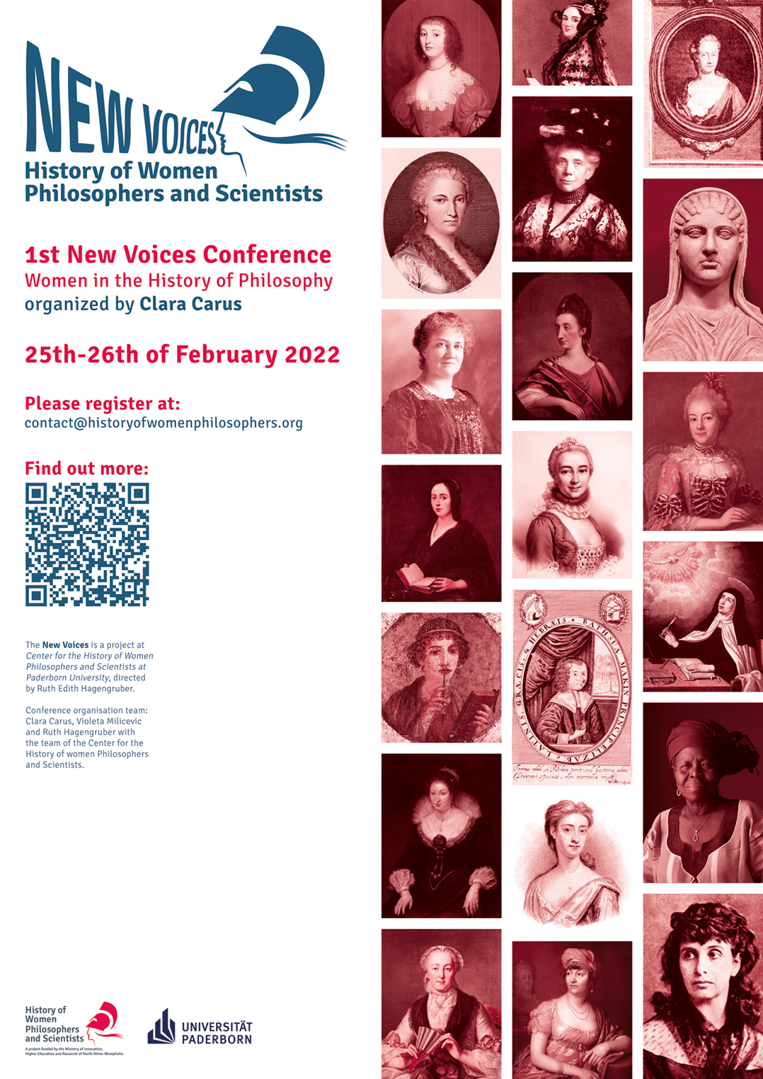On February 25 and 26, the "New Voices" group of the "Center for the History of Women Philosophers and Scientists" (HWPS) at Paderborn University invites to its first conference. More than 70 international speakers will present their research on women in the history of philosophy, including Priyanka Jha (Banaras Hindu University/University of Cambridge), Samantha Matherne (Harvard University), Julia Borcherding (University of Cambridge) and Pedro Pricladnitzky (Universidade Estadual do Oeste do Paraná). Participation in the digital event is free of charge. To register, send an email with the subject "Registration New Voices" to contact@historyofwomenphilosophers.org.