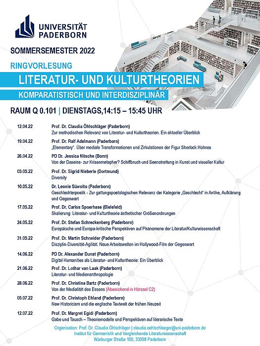 In der ersten Vorlesung am 12. April gibt Prof. Dr. Claudia Öhlschläger ein Überblick über die Theorie- und Methodenvielfalt der Literatur- und Kulturwissenschaften seit dem ausgehenden 20. Jahrhundert bis zur Gegenwart. Abschluss der Reihe bildet das Thema „Gabe und Tausch – Theoriemodelle und Perspektiven auf literarische Texte“ am 12. Juli. Die Themen der einzelnen Veranstaltungen sind auf dem Plakat zur Ringvorlesung zu finden.