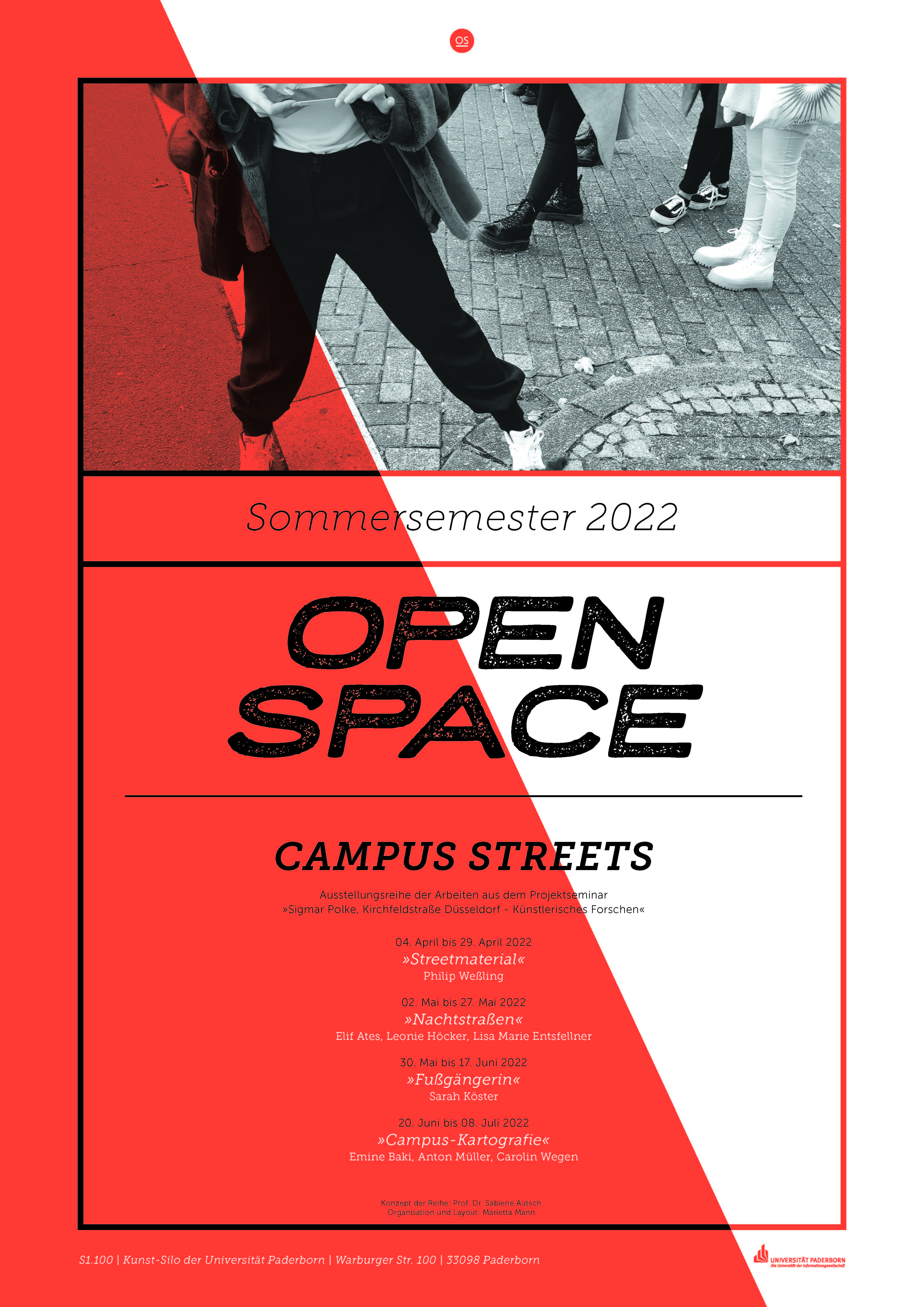 Im Sommersemester 2022 wird im Ausstellungsraum OPEN SPACE des Faches Kunst der Universität Paderborn die vierteilige Ausstellungsreihe „CAMPUS STREETS“ präsentiert. Thematisch passend zum 50. Jubiläumsjahr der Universität Paderborn werden künstlerische Arbeiten von Teilnehmenden des Projektseminars „Sigmar Polke, Kirchfeldstraße Düsseldorf – Künstlerisches Forschen“ gezeigt, die über ein Semester die Straßen auf dem Campus erforschten.